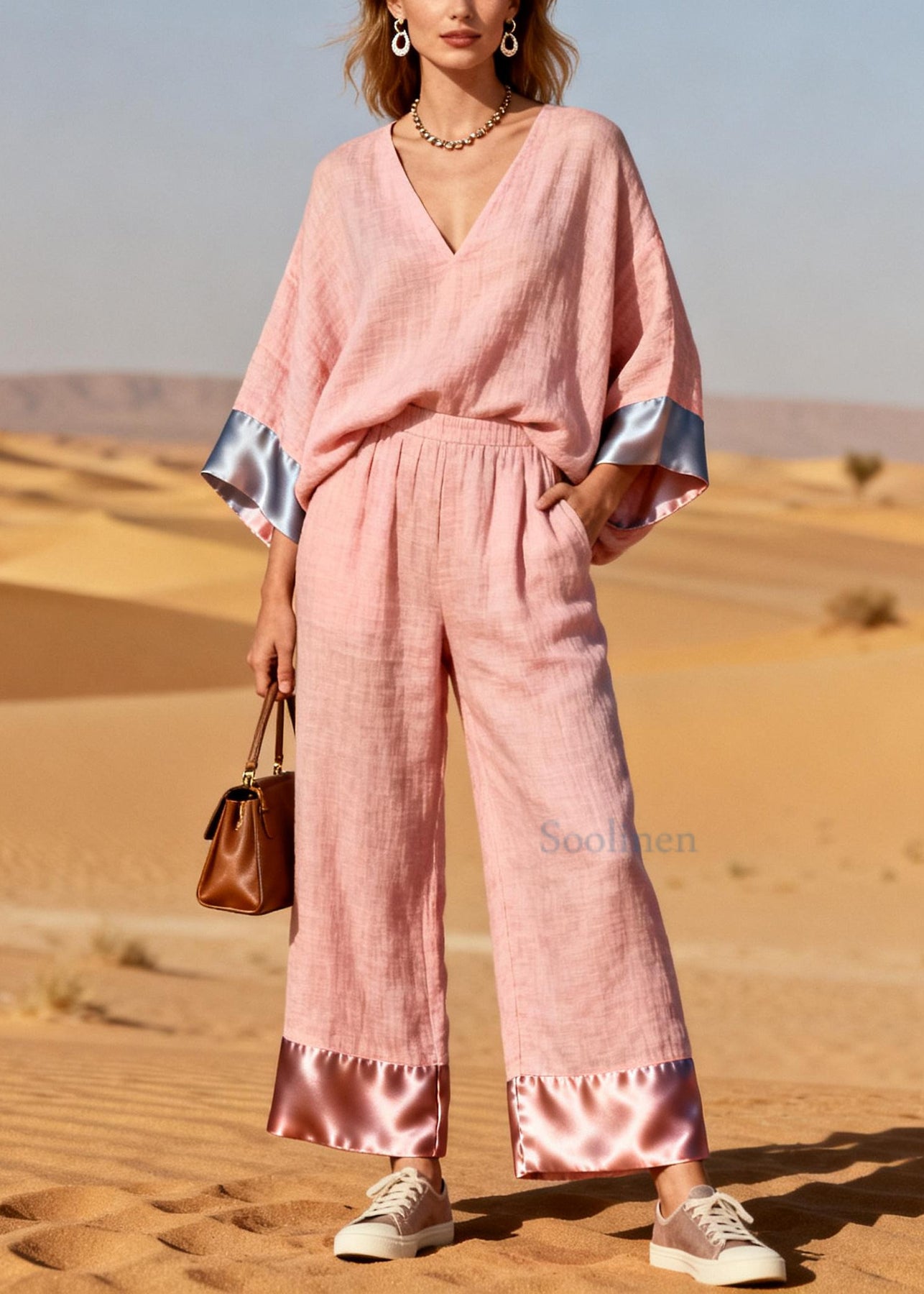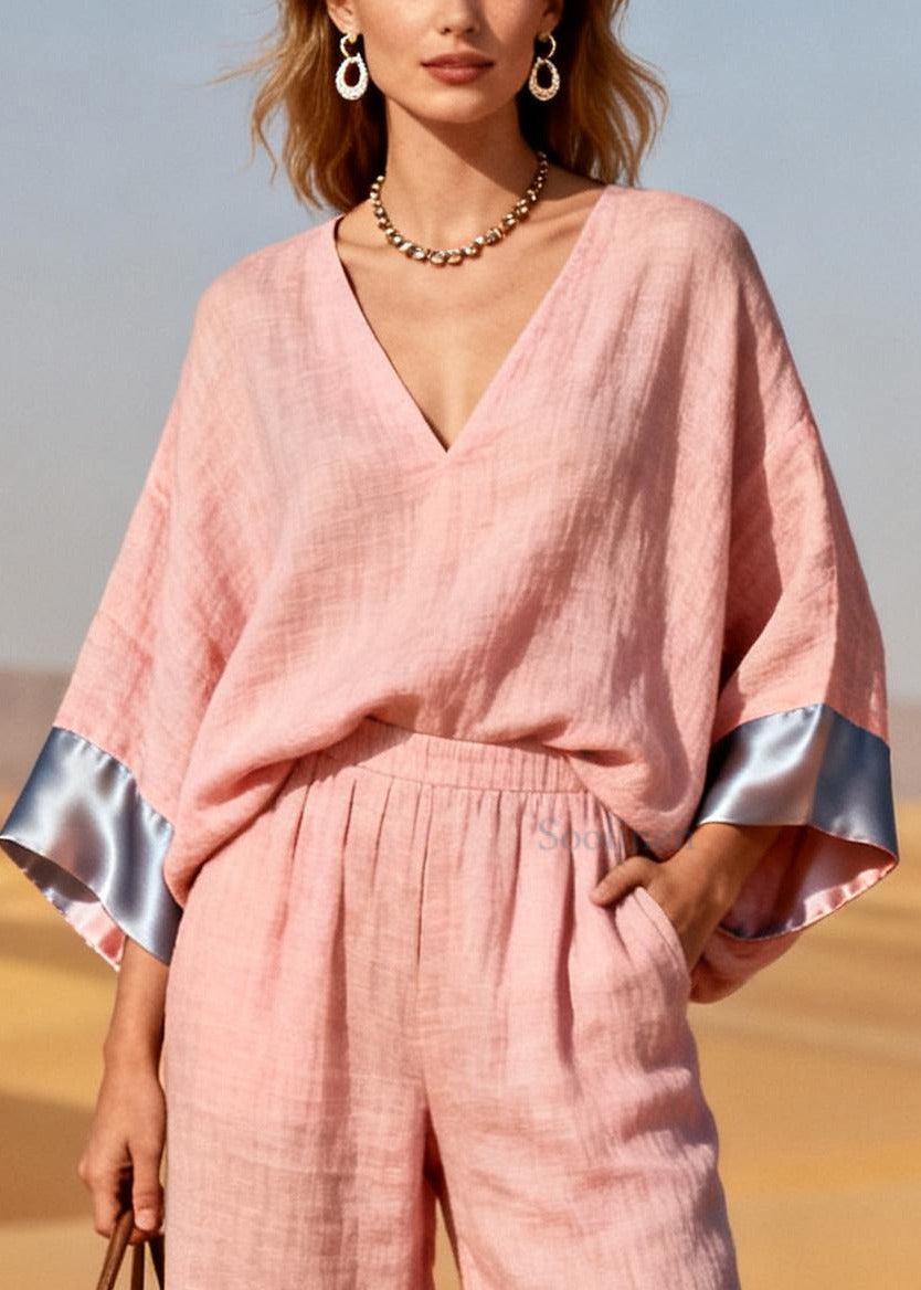 Plus Size Pink Oversized Patchwork Linen Silk Two Pieces Set Spring