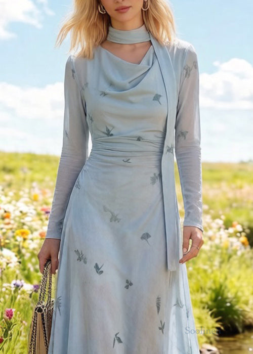Slim Fit Light Blue Bow Print Cinched Tulle Long Dress Spring