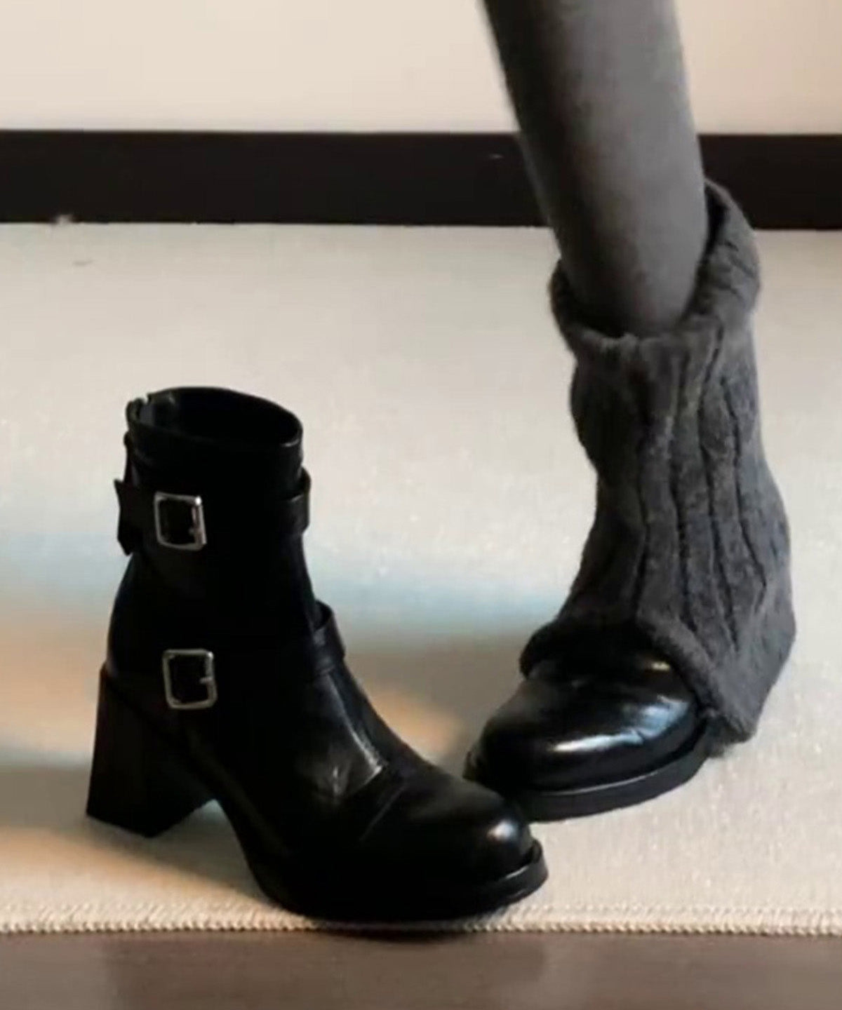 Stylish Black Cowhide Leather Splicing Chunky Heel Boots