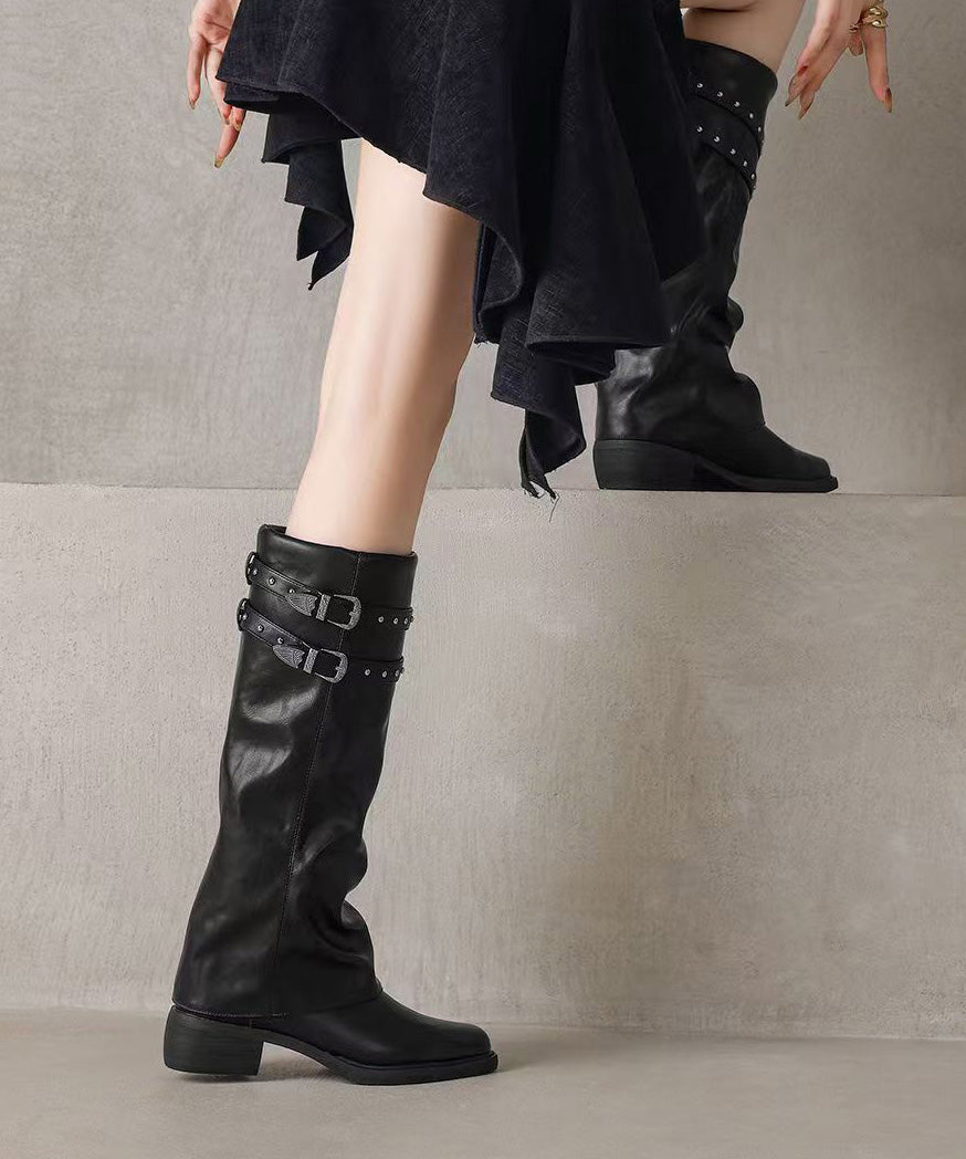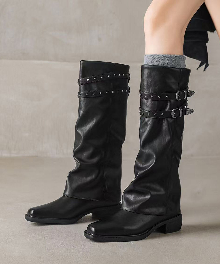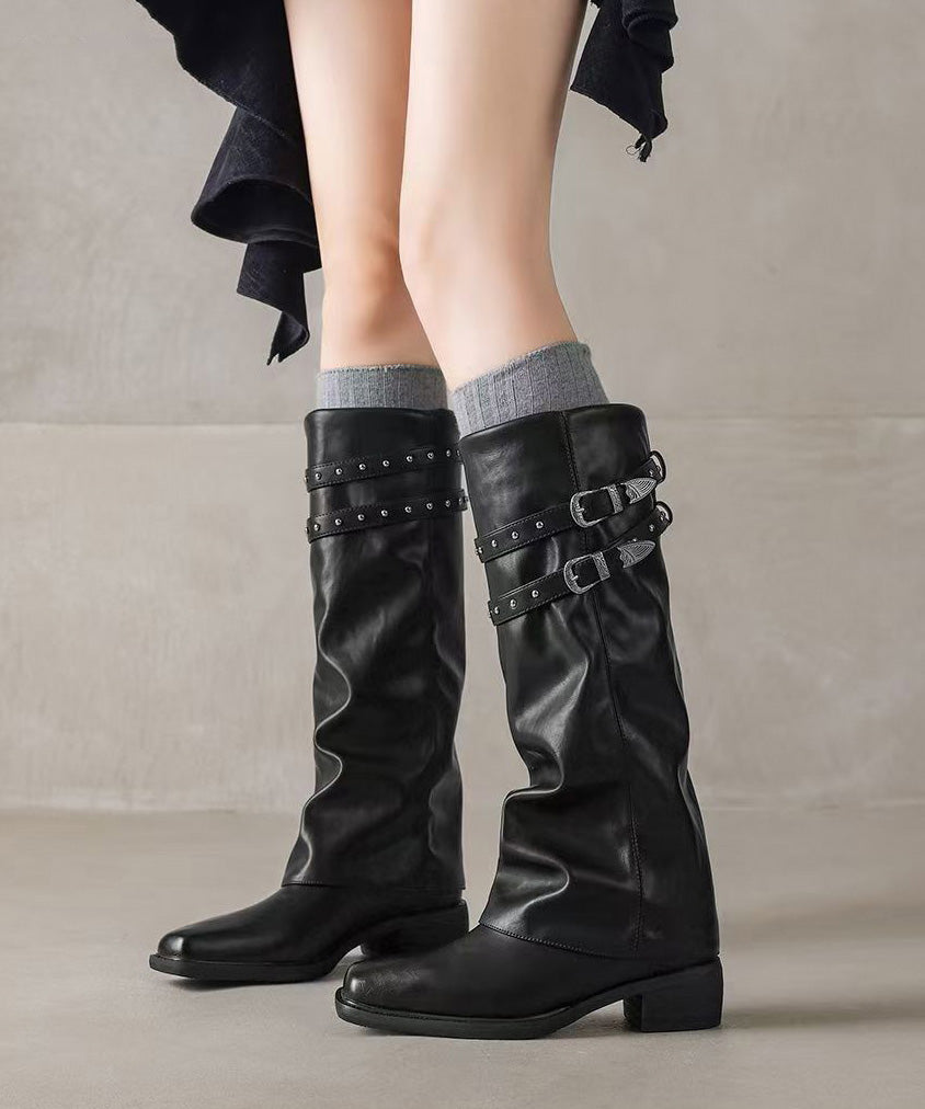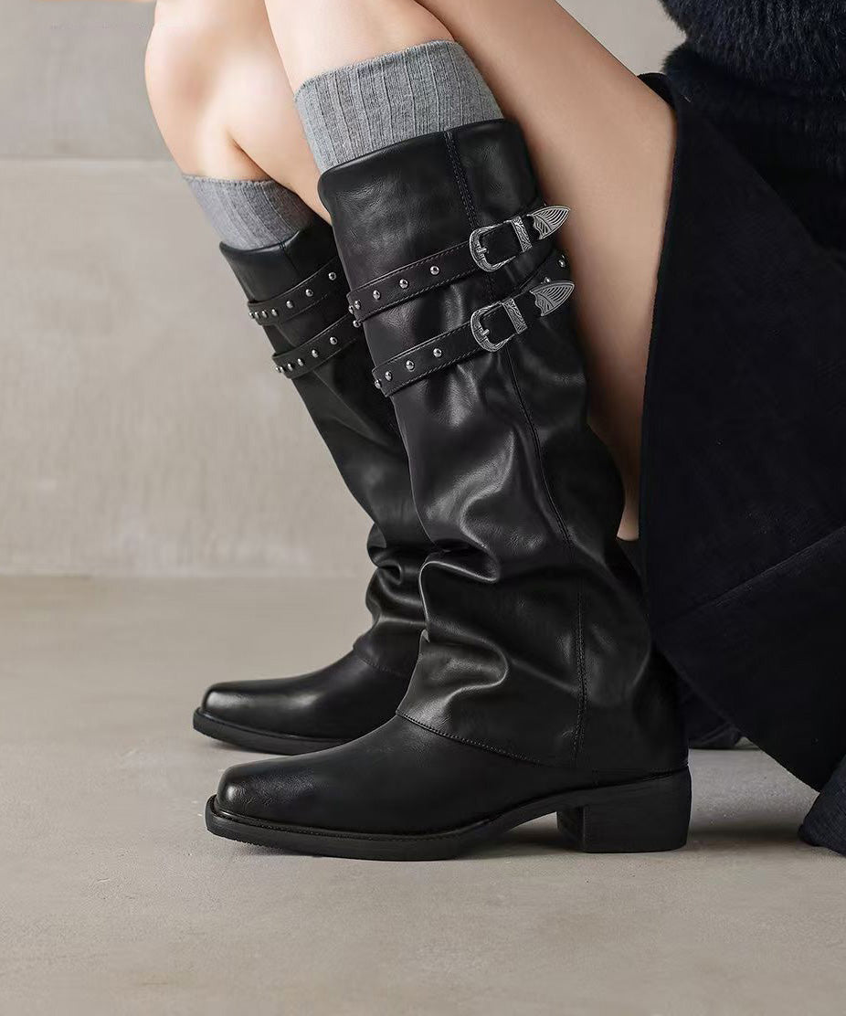 Stylish Rivet Splicing Chunky Boots Black Faux Leather