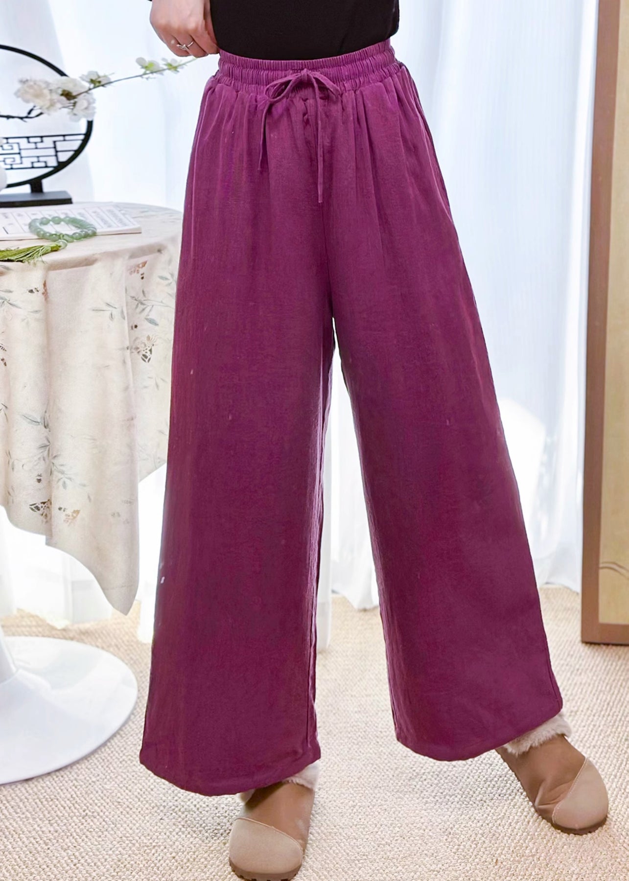 New Purple Pockets Elastic Waist Fine Cotton Filled Pants Winter