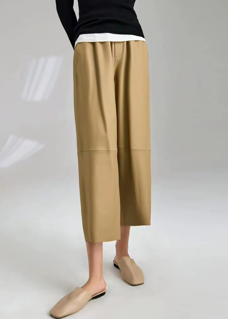French Black Pockets Elastic Waist Sheepskin Crop Pants Spring