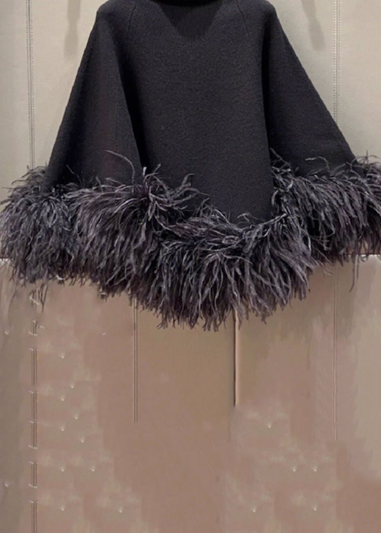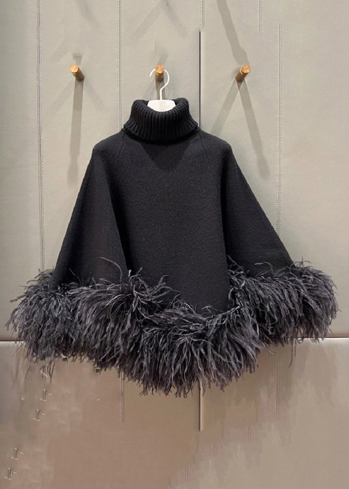 French Black Turtleneck Fluffy Patchwork Woolen Cape Tops Spring