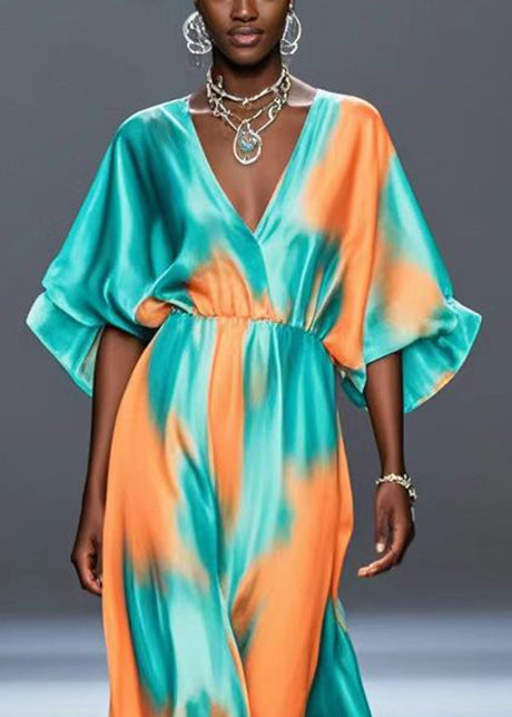 Organic Green V Neck Tie Dye Silk Dress Batwing Sleeve
