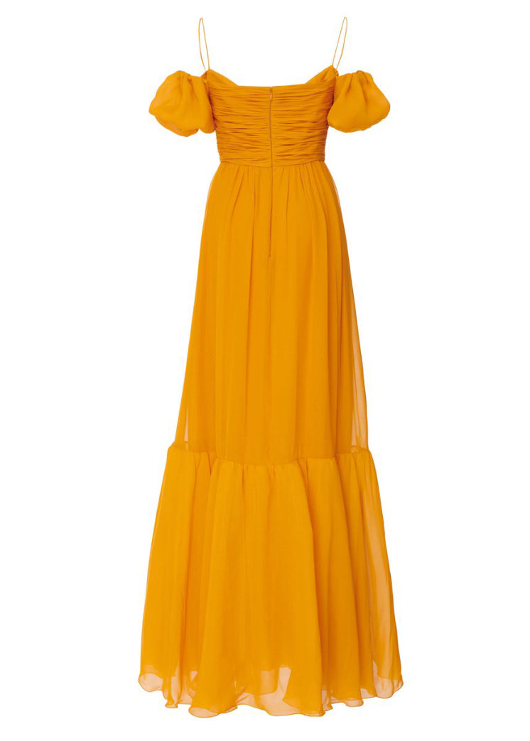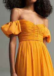 French Yellow Cinched Cold Shoulder Chiffon Long Dresses Summer
