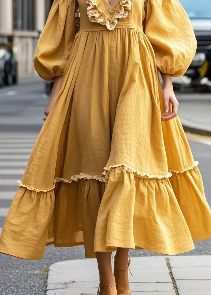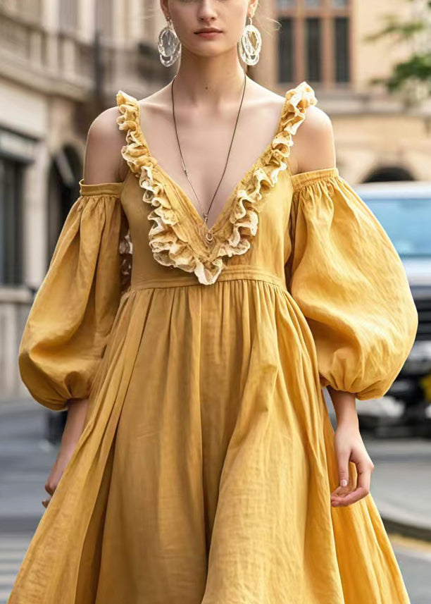 Beautiful Yellow Cold Shoulder Ruffled Party Dresses Lantern Sleeve