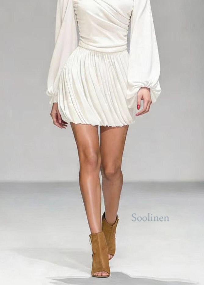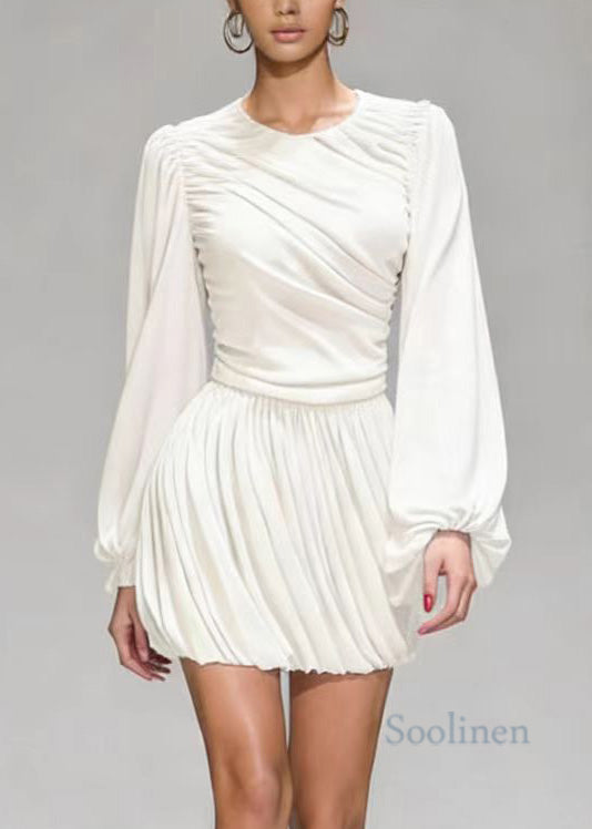 Elegant White O Neck Wrinkled Patchwork Mid Dress Lantern Sleeve