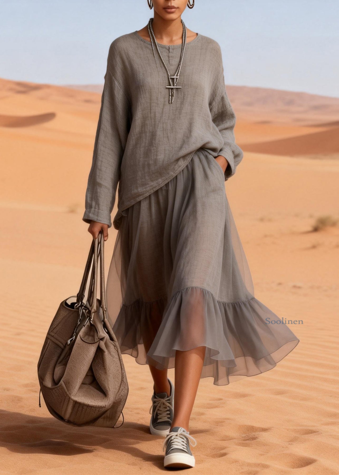 Loose Charcoal Grey Pockets Tops And Skirts Tulle Patchwork Two Pieces Set Spring
