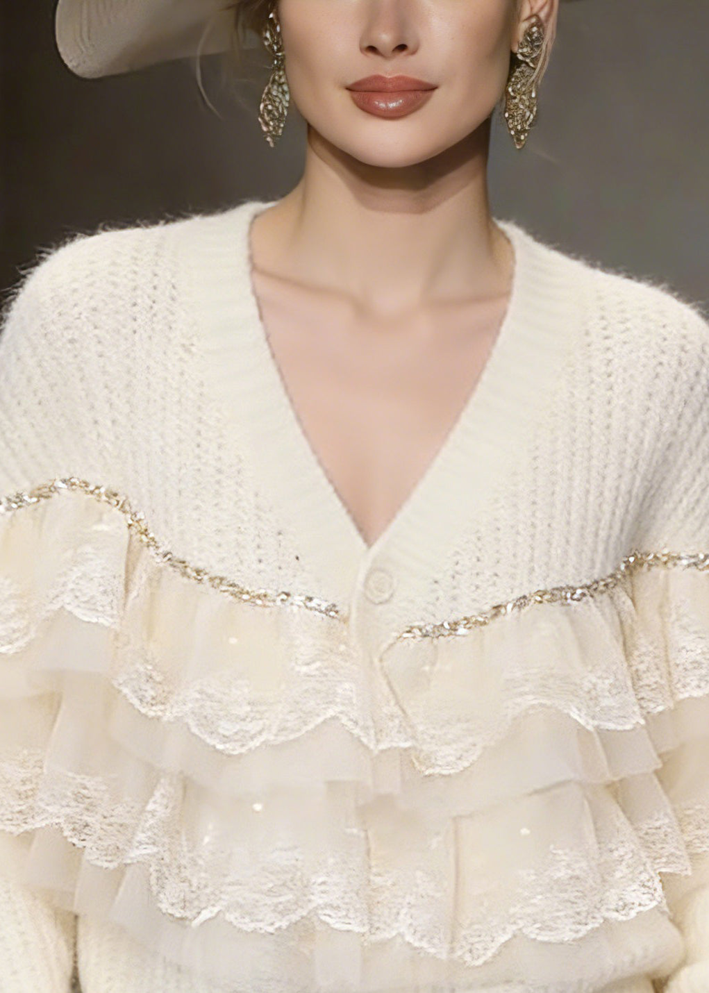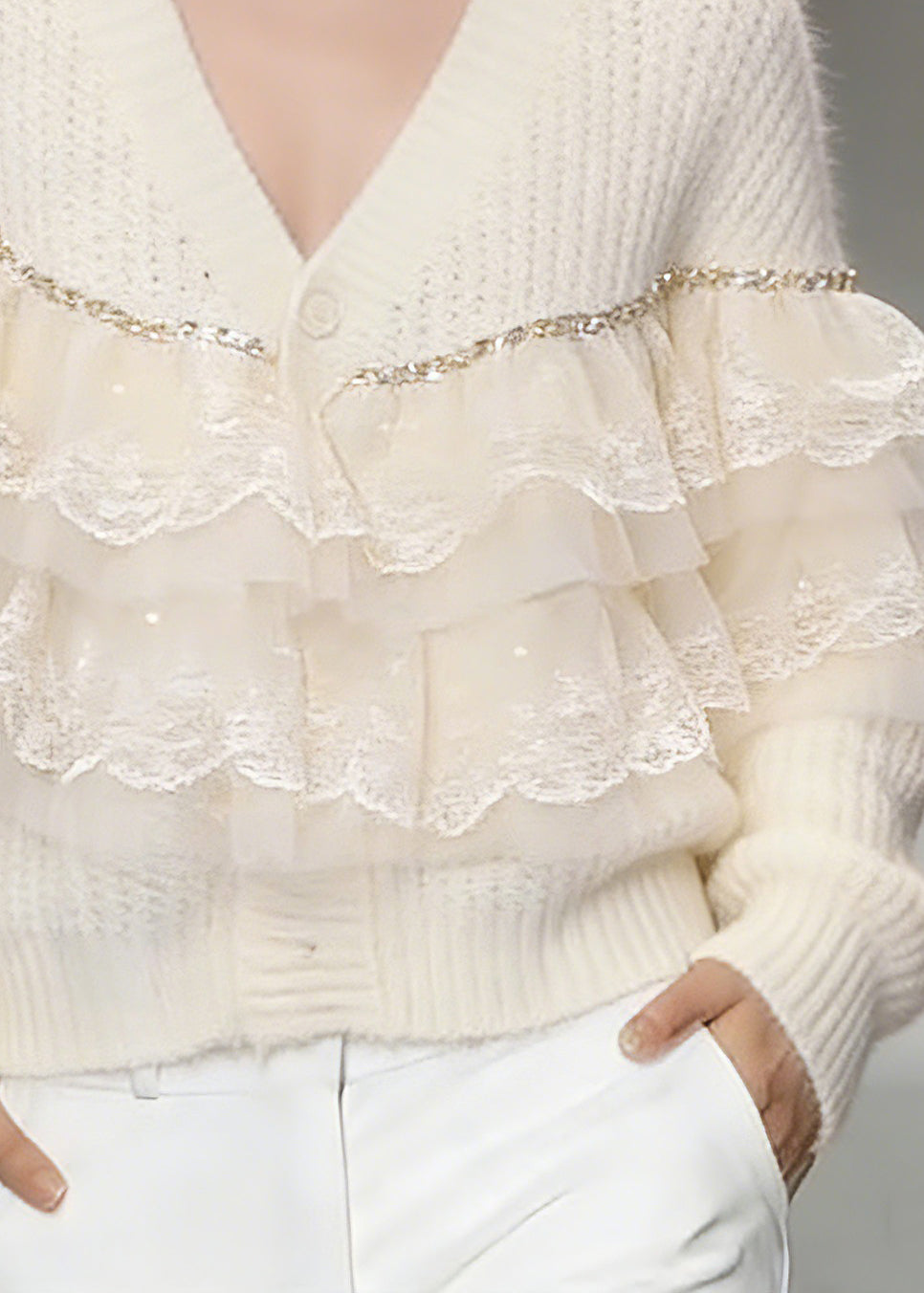 Handmade Beige Lace Patchwork Cotton Knit Cardigans Spring
