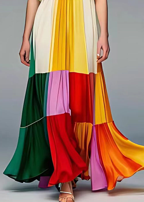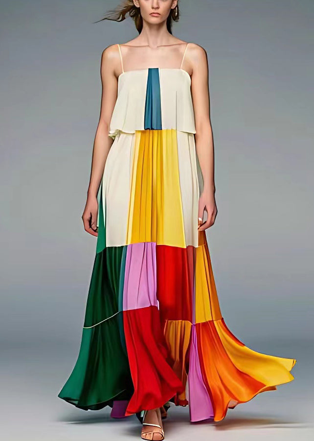 Beautiful Beige Wrinkled Patchwork Silk Spaghetti Strap Dress Sleeveless