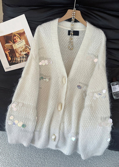 Handmade White V Neck Button Sequins Woolen Cardigan Fall