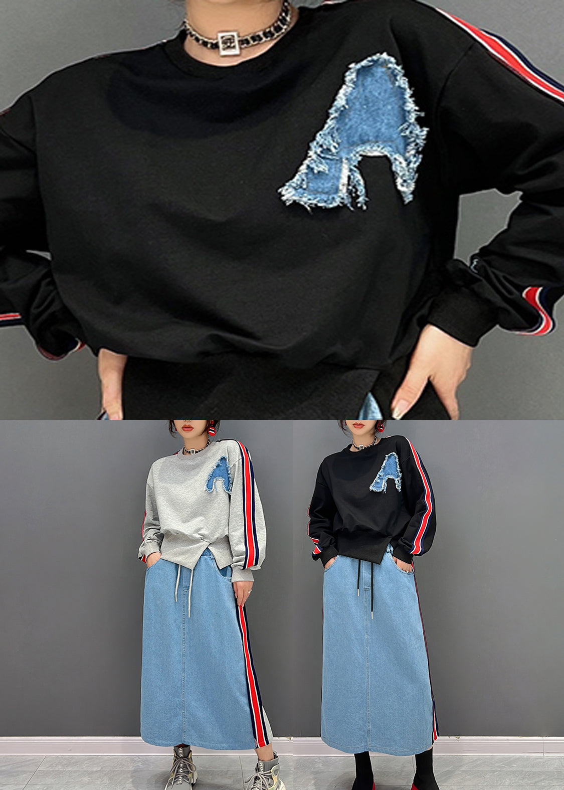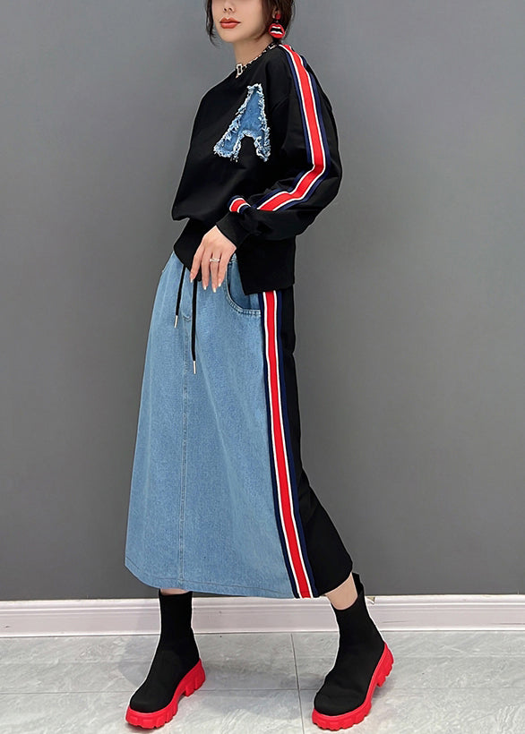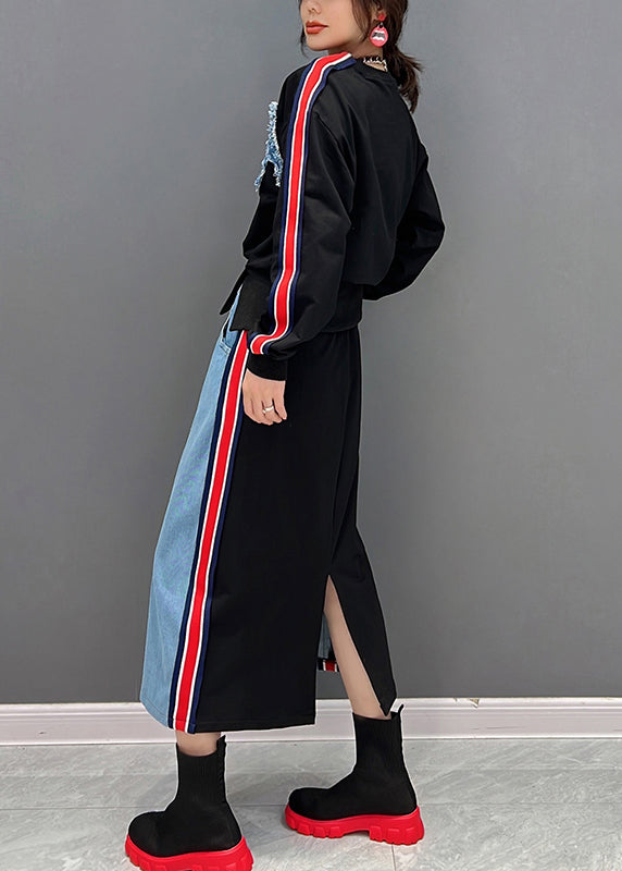 Black O-Neck Striped Pullover And Skirts Two Piece Suit Set Fall