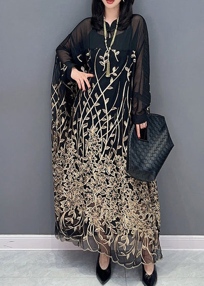 Classy Black Stand Collar Embroideried Button Tulle Maxi Dress Long Sleeve