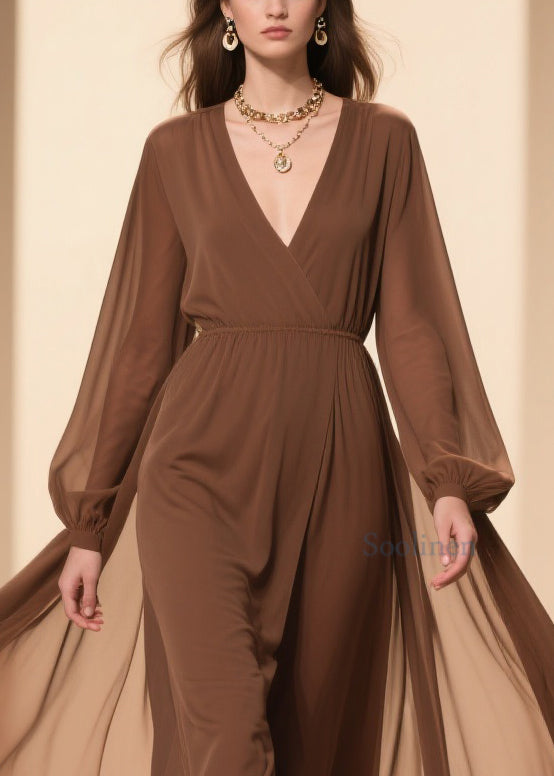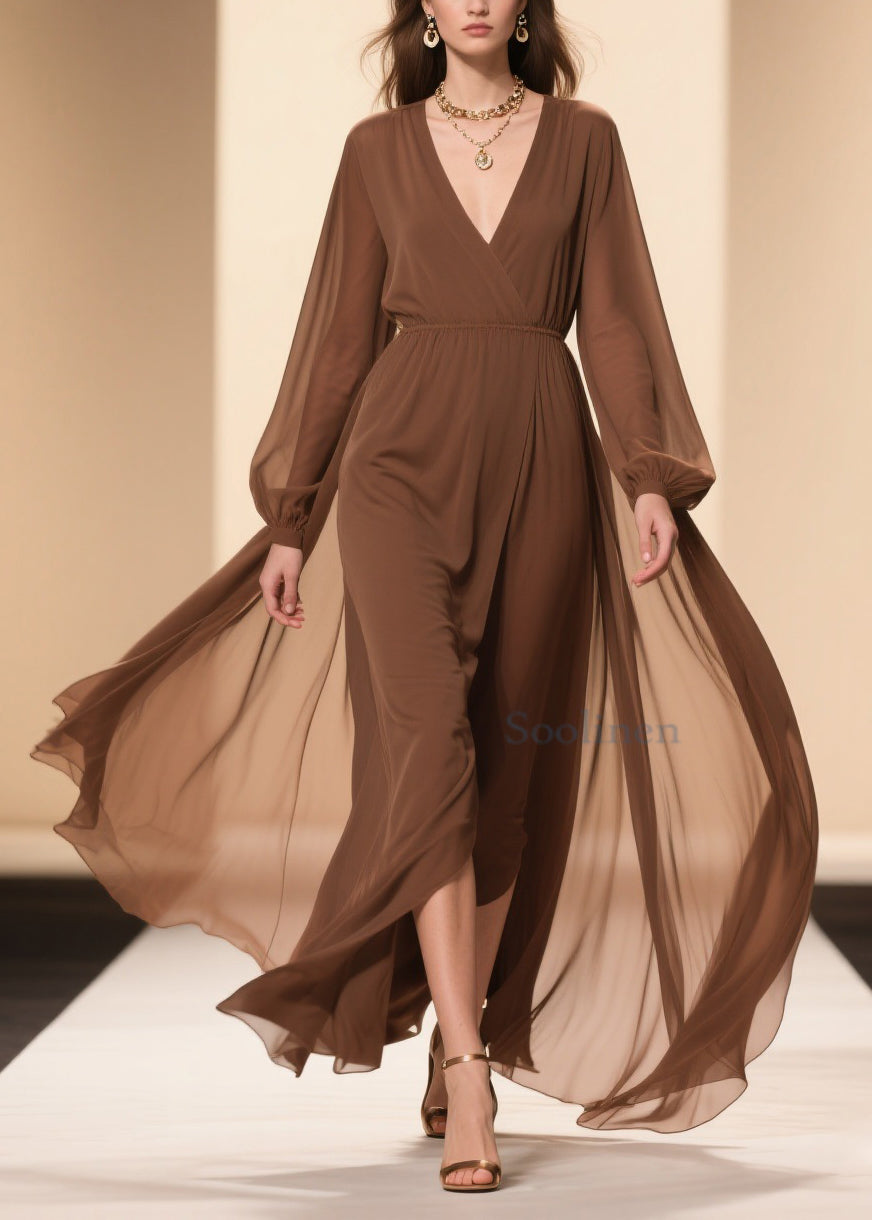 Coffee Wrinkled Solid Chiffon Maxi Dresses V Neck