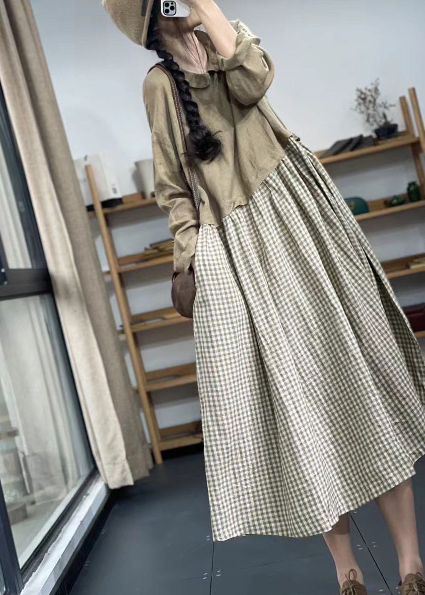 French Khaki Pockets Patchwork Linen Long Dresses Spring