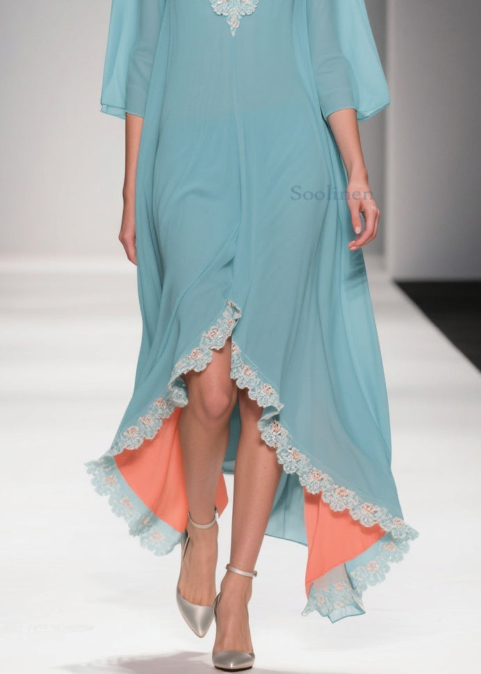 Loose Mint Green Blue Asymmetrical Lace Chiffon Dress Half Sleeve