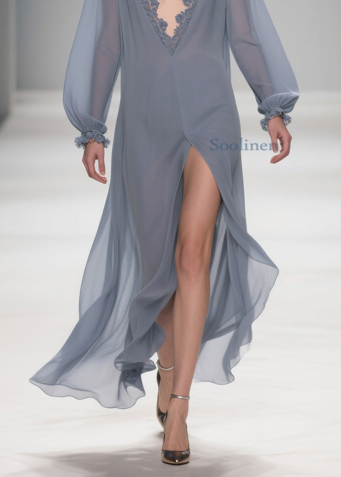 Original Design Blue Lace Side Open Solid Long Dress Lantern Sleeve