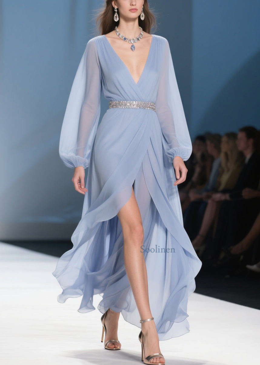Sky Blue Wrinkled Low High Design Long Dresses V Neck