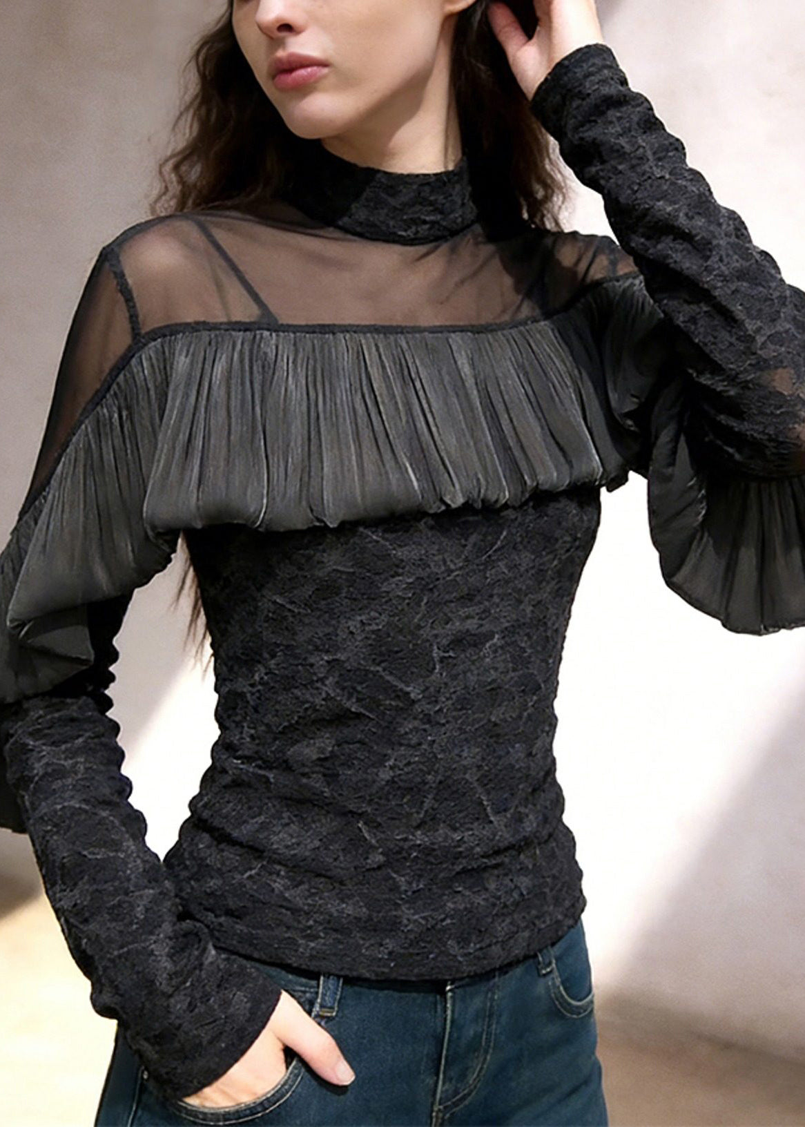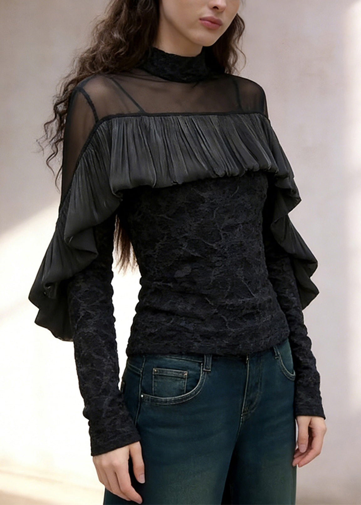 French Black Turtleneck Ruffled Tulle Patchwork T Shirt Spring