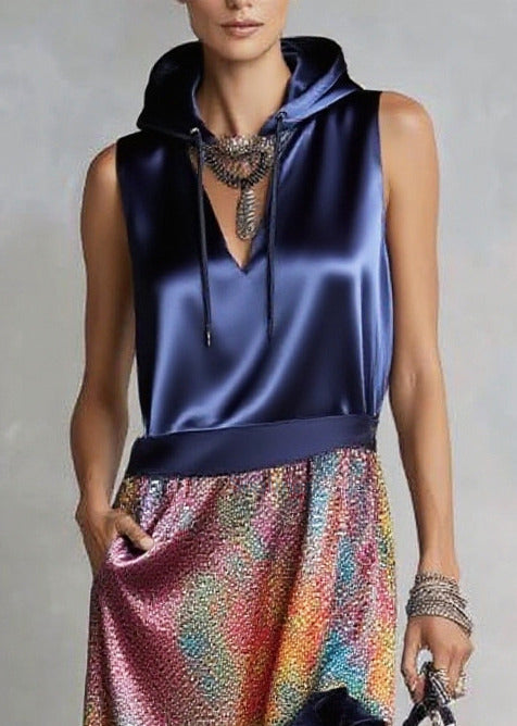Italian Navy Ruffled Patchwork Print Silk Robe Dresses Sleeveless