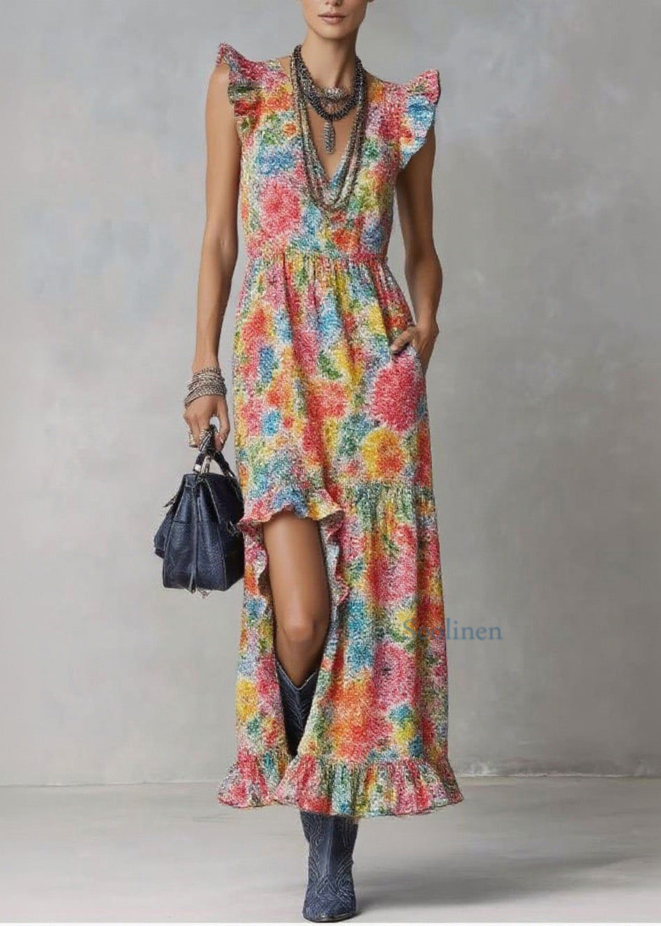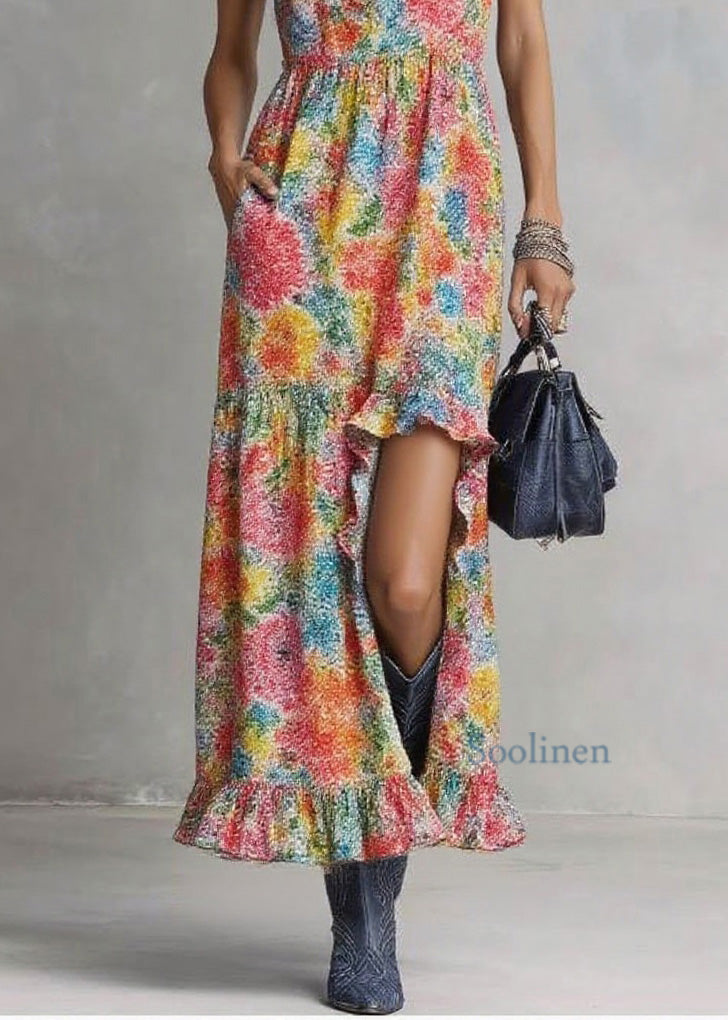 Style V Neck Ruffled Print Cotton Long Dresses Summer