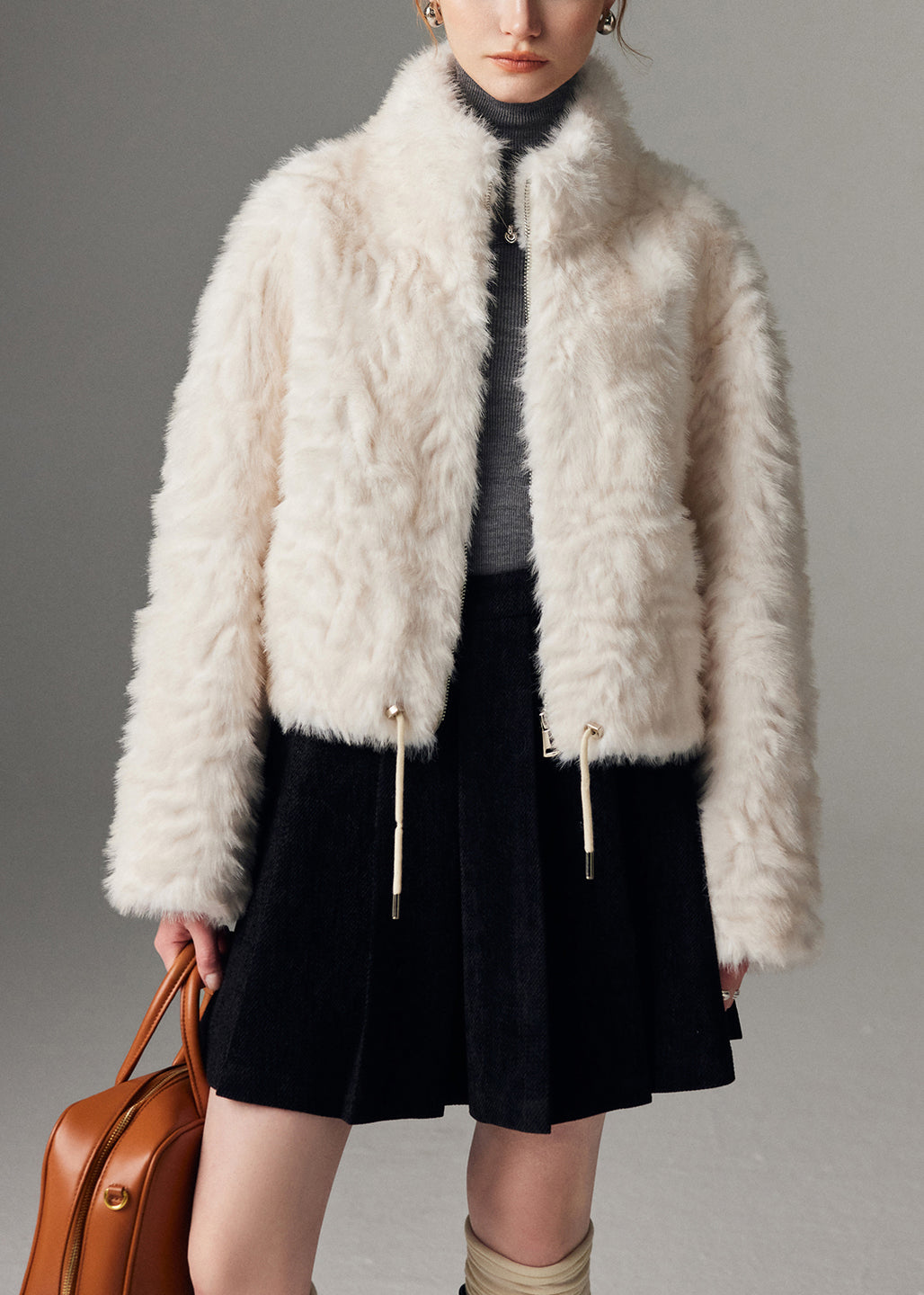 New White Stand Collar Leather Zippered Cinched And Fur Coats Winte