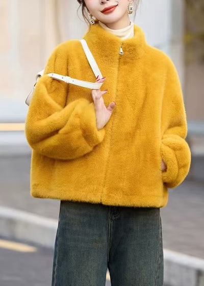 Chic Yellow Stand Collar Zip Up Faux Fur Short Coats Winter