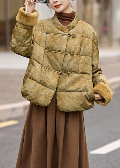 Retro Yellow O Neck Pockets Patchwork Duck Down Jackets Winter