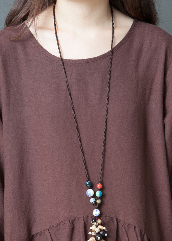 Loose Rust Red O Neck Wrinkled Patchwork Long Linen Dress Spring