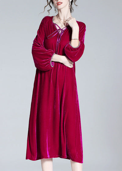 Handmade Red V Neck Neck Tie Solid Velour Maxi Dress Spring