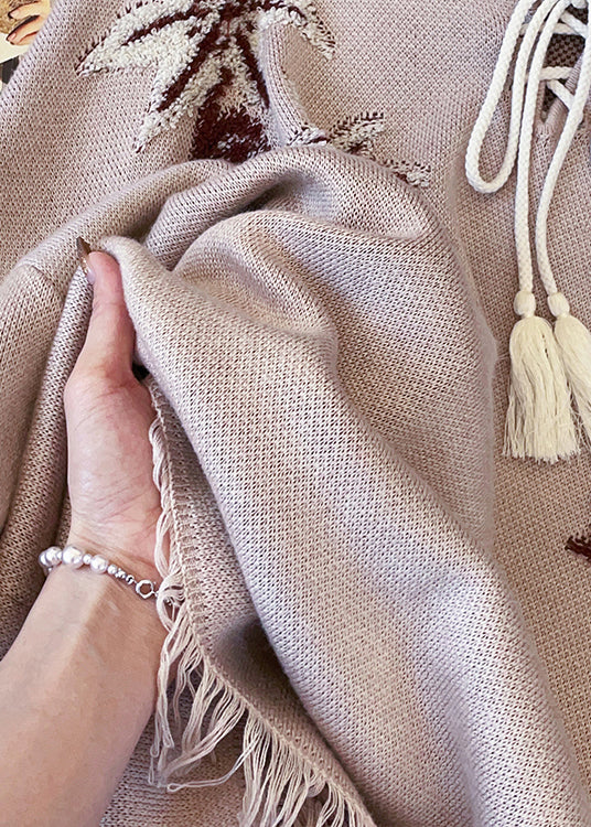 Loose Khaki Hooded Embroidered Lace Up Knit Sweater Tops Fall