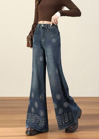Handmade Blue Embroidered Hollow Out Denim Flared Trousers Fall
