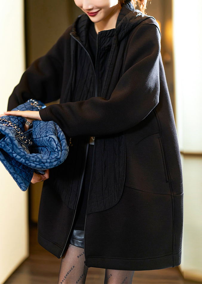Loose Black Hooded Zippered Patchwork Thick Coats Spring