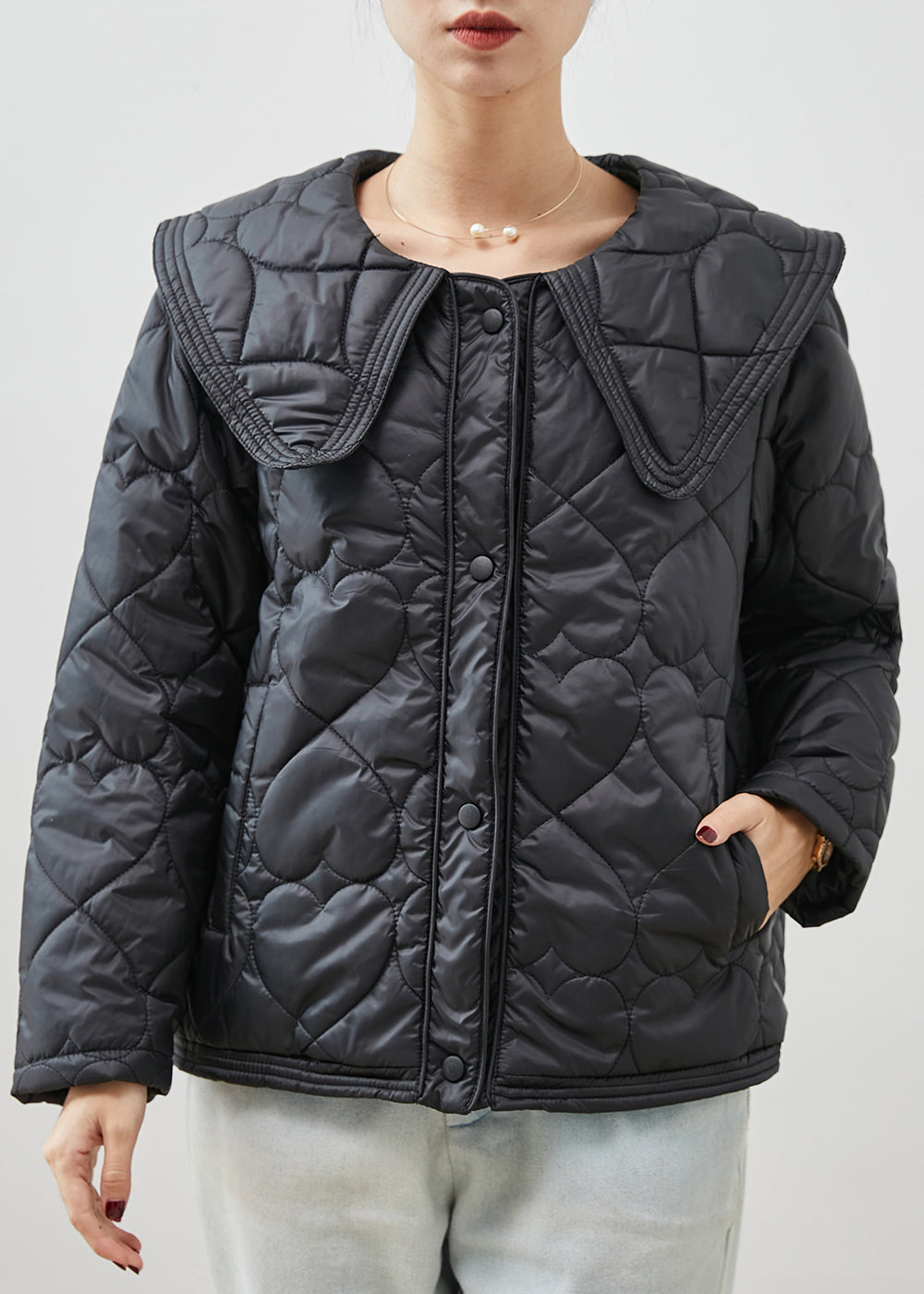 Modern Black Peter Pan Collar Pockets Fine Cotton Filled Coat Spring