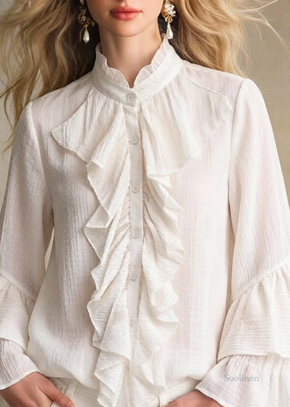 Elegant Apricot Stand Collar Ruffled Button Cotton Shirt