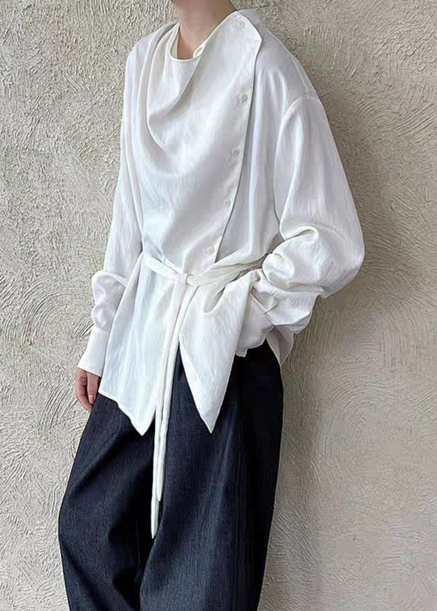 White Stand Collar Button Solid Shirts Lantern Sleeve