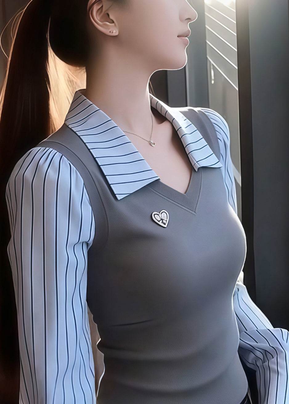 Slim Fit Grey Striped False Two Pieces Patchwork Knit Sweaters Winter