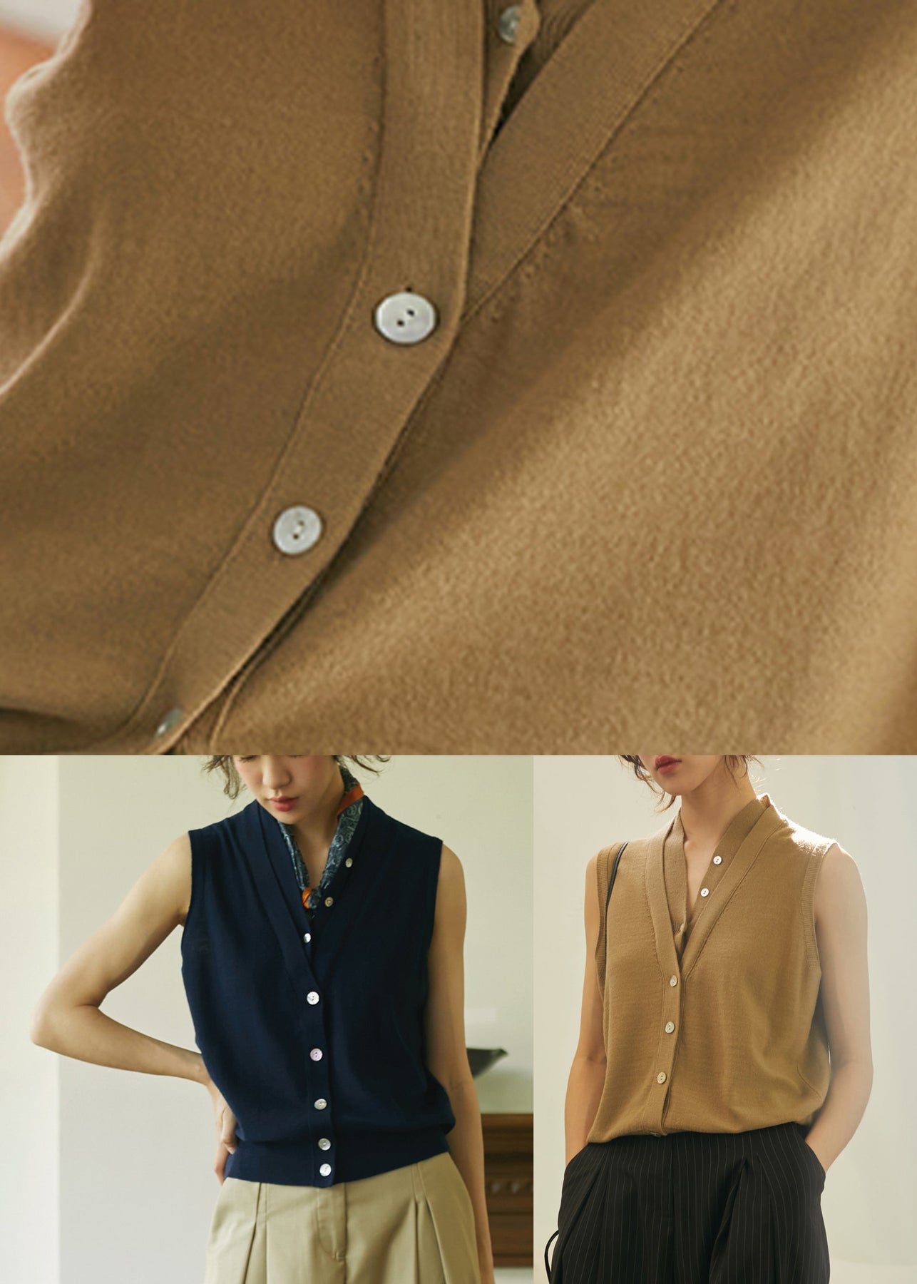 Art Khaki V Neck Solid Thin Knit Woolen Top Summer