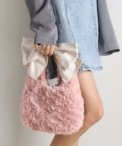 Fashion Pink Bow Faux Rabbit Fur Evening Tote Handbag