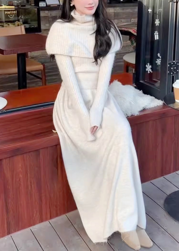 Simple Wine Red Turtleneck Cape Sweaters And Skirts Knit Three Pieces Set Winter