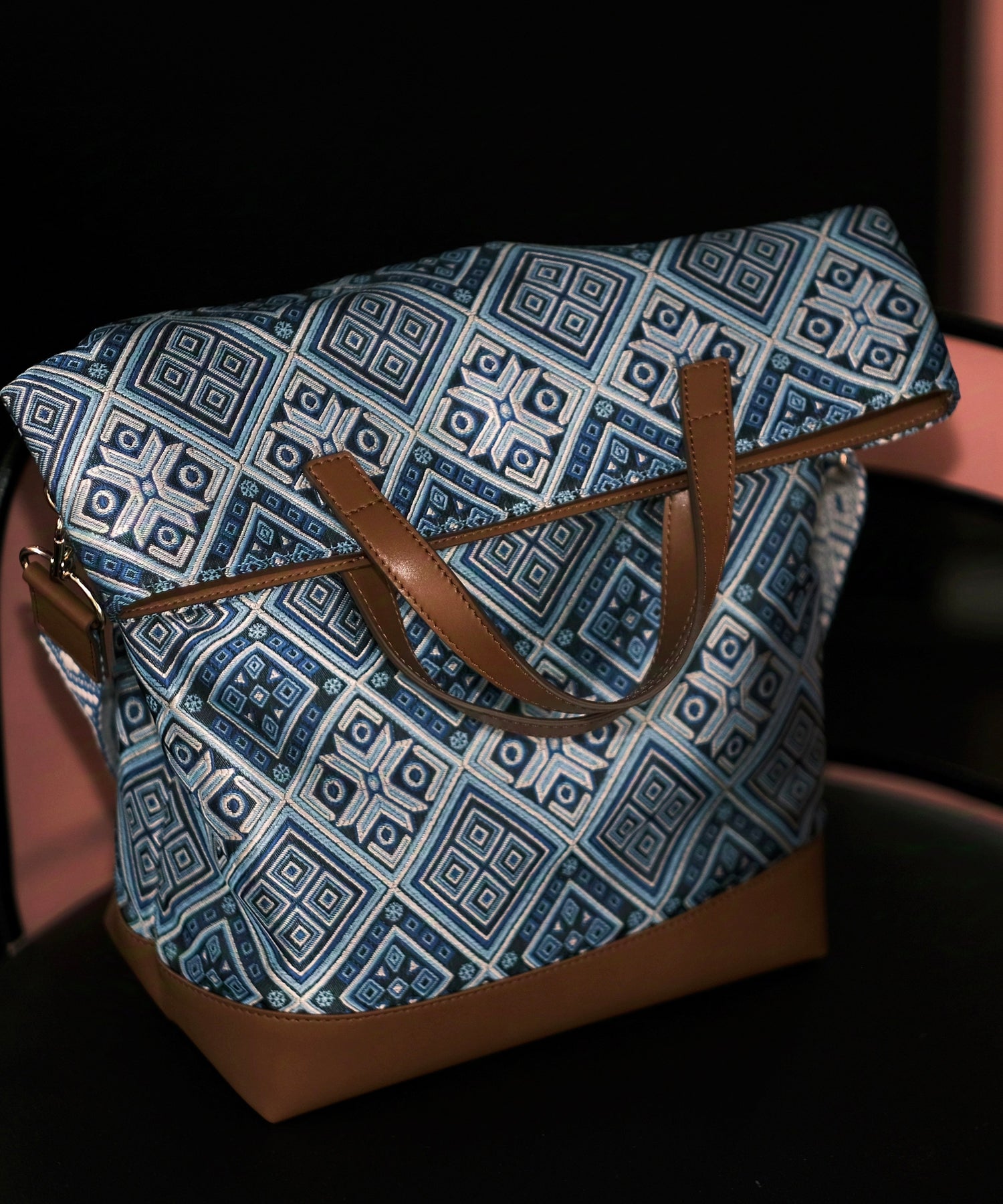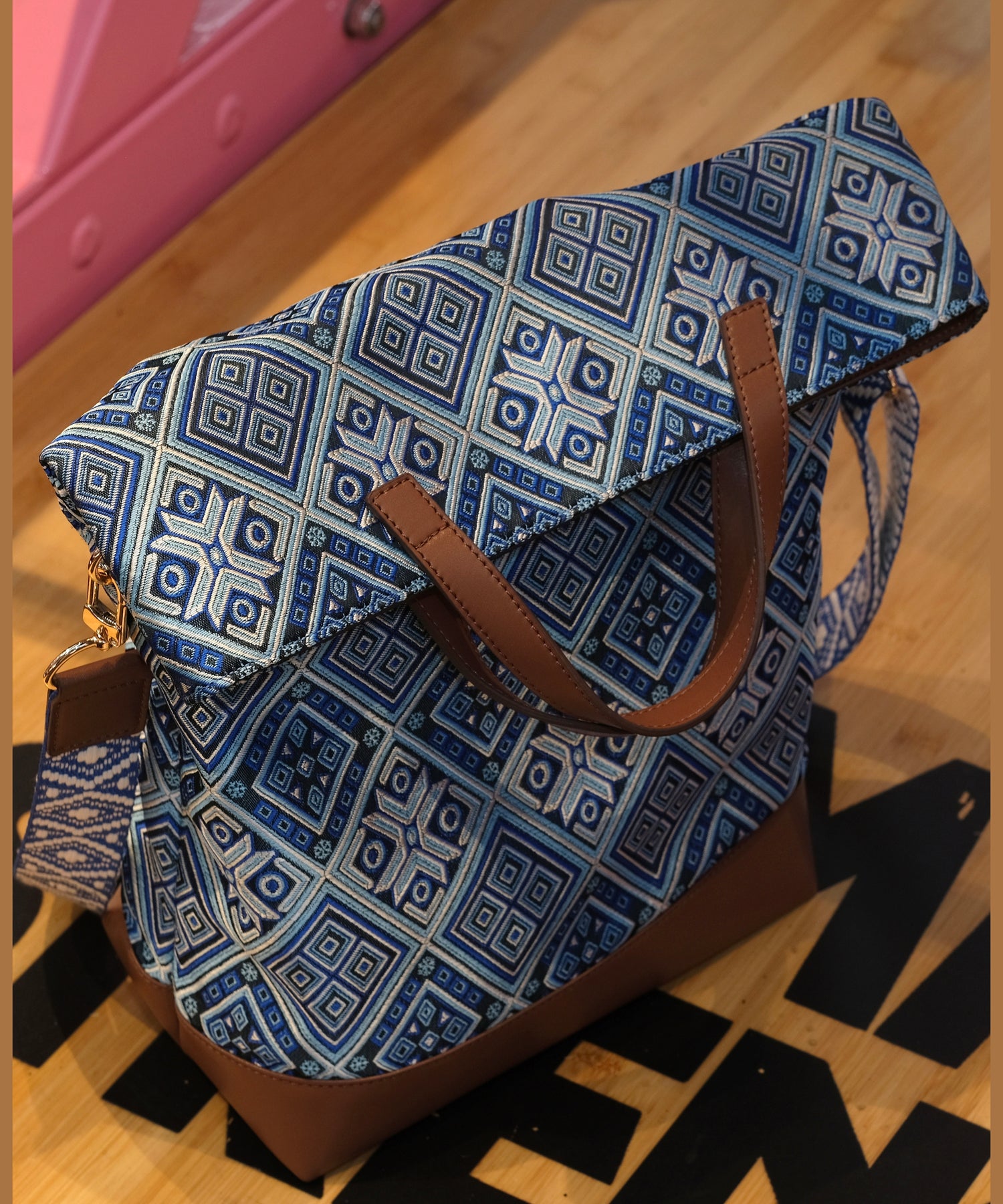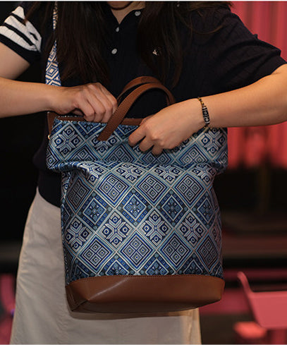 DIY Blue Jacquard Patchwork Large Capacity Faux Leather Tote Handbag