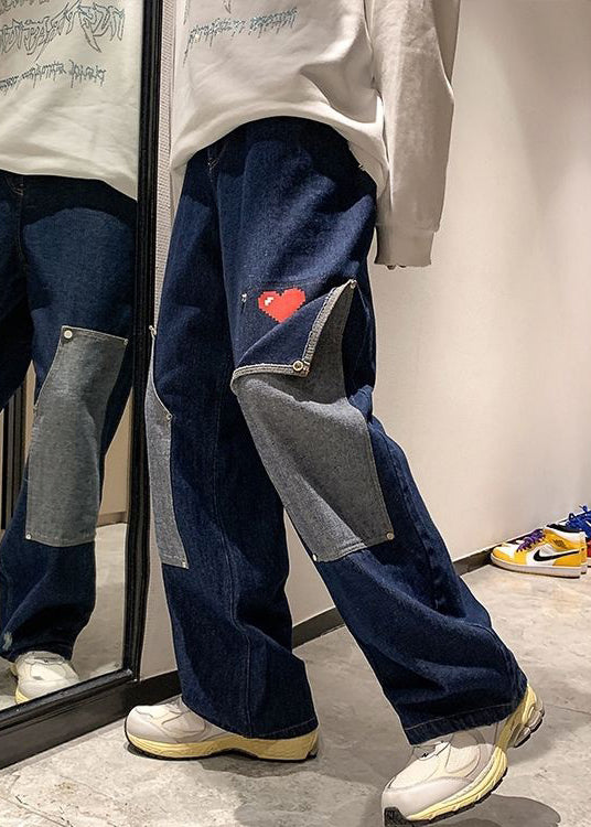 Navy Pockets Patchwork Denim High Waist Mens Pants