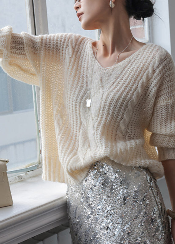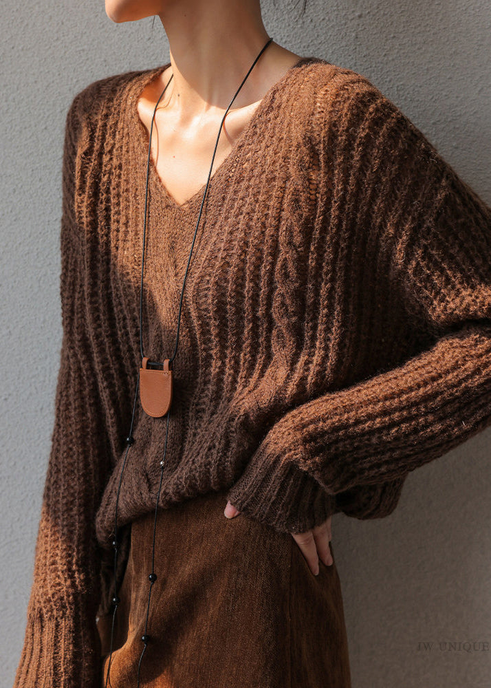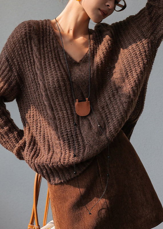 Casual Coffee V Neck Cotton Knit Sweater Spring