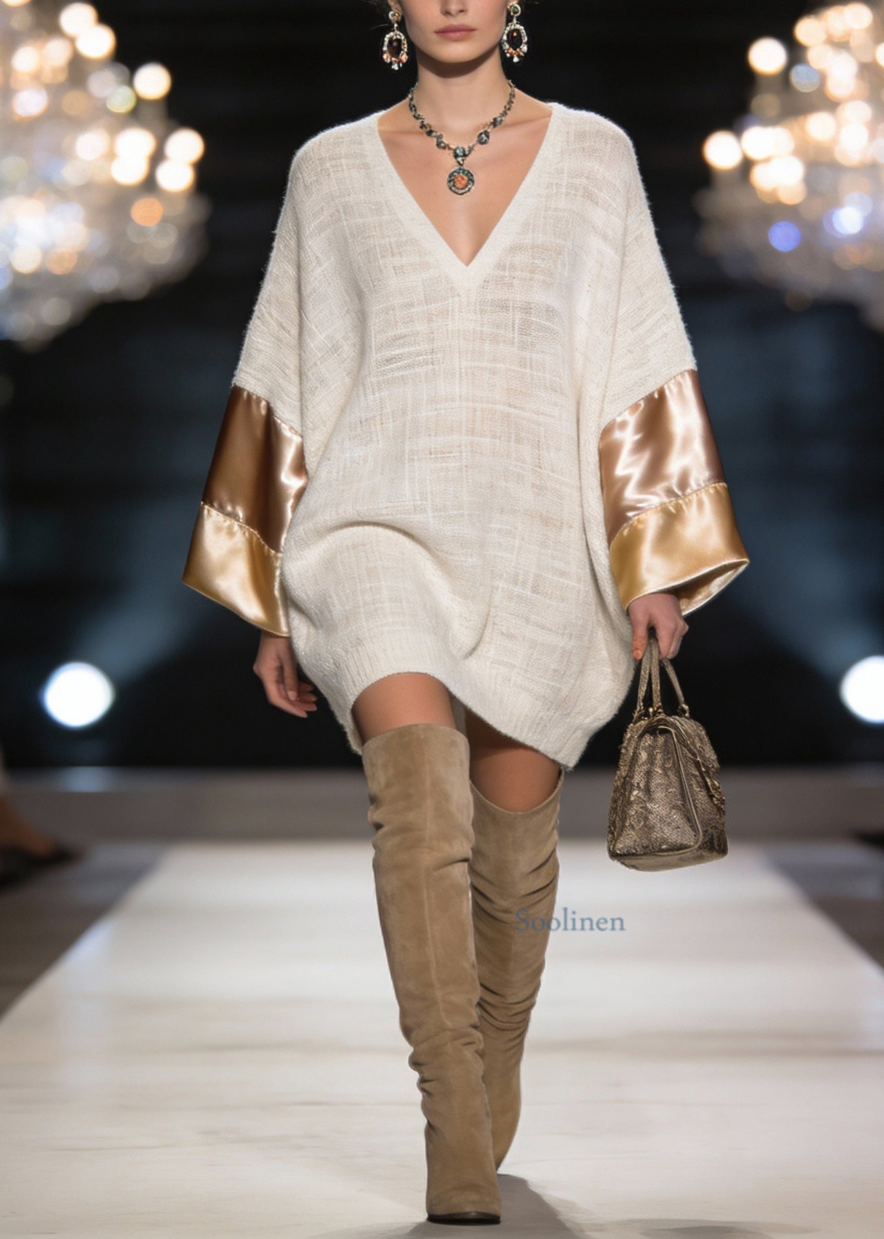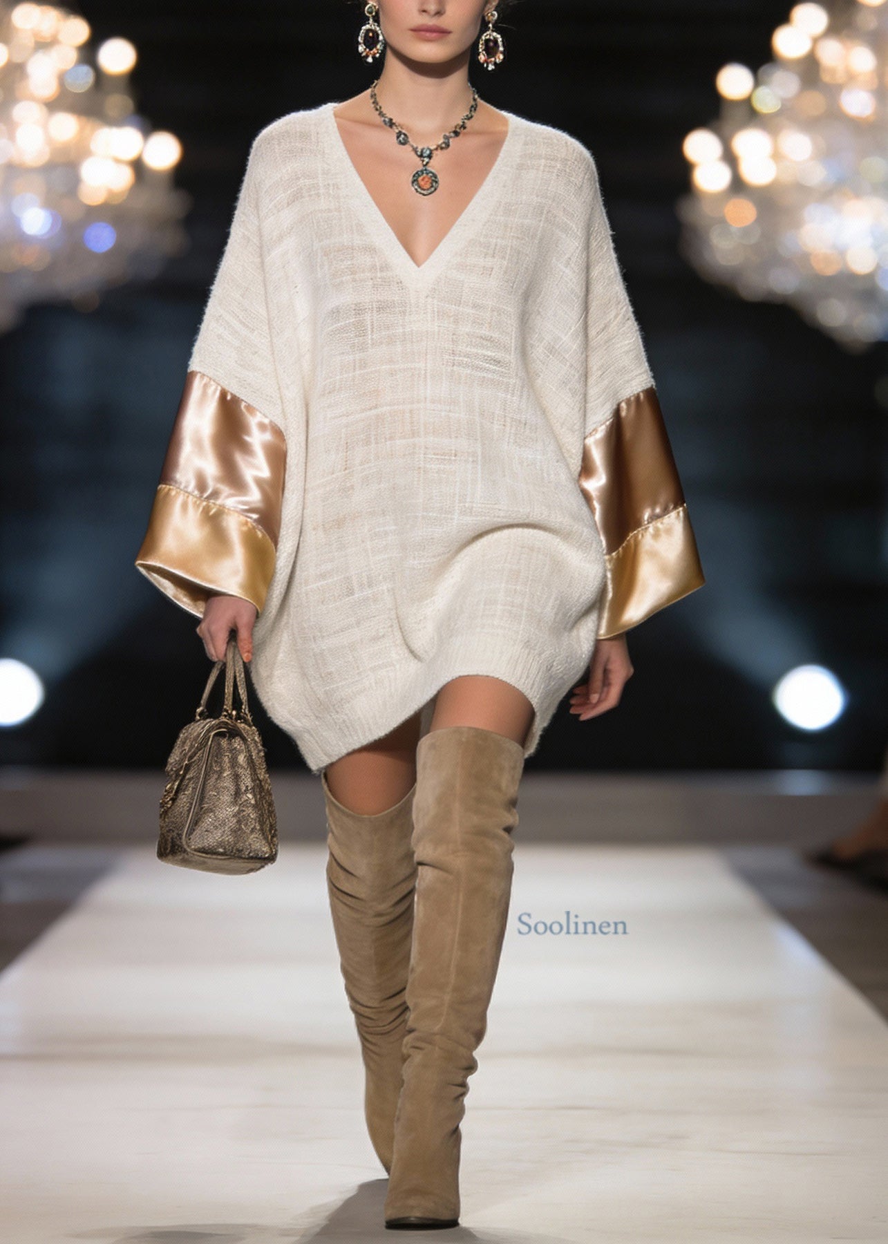 Elegant V Neck Silk Patchwork Linen Mid Dress Spring