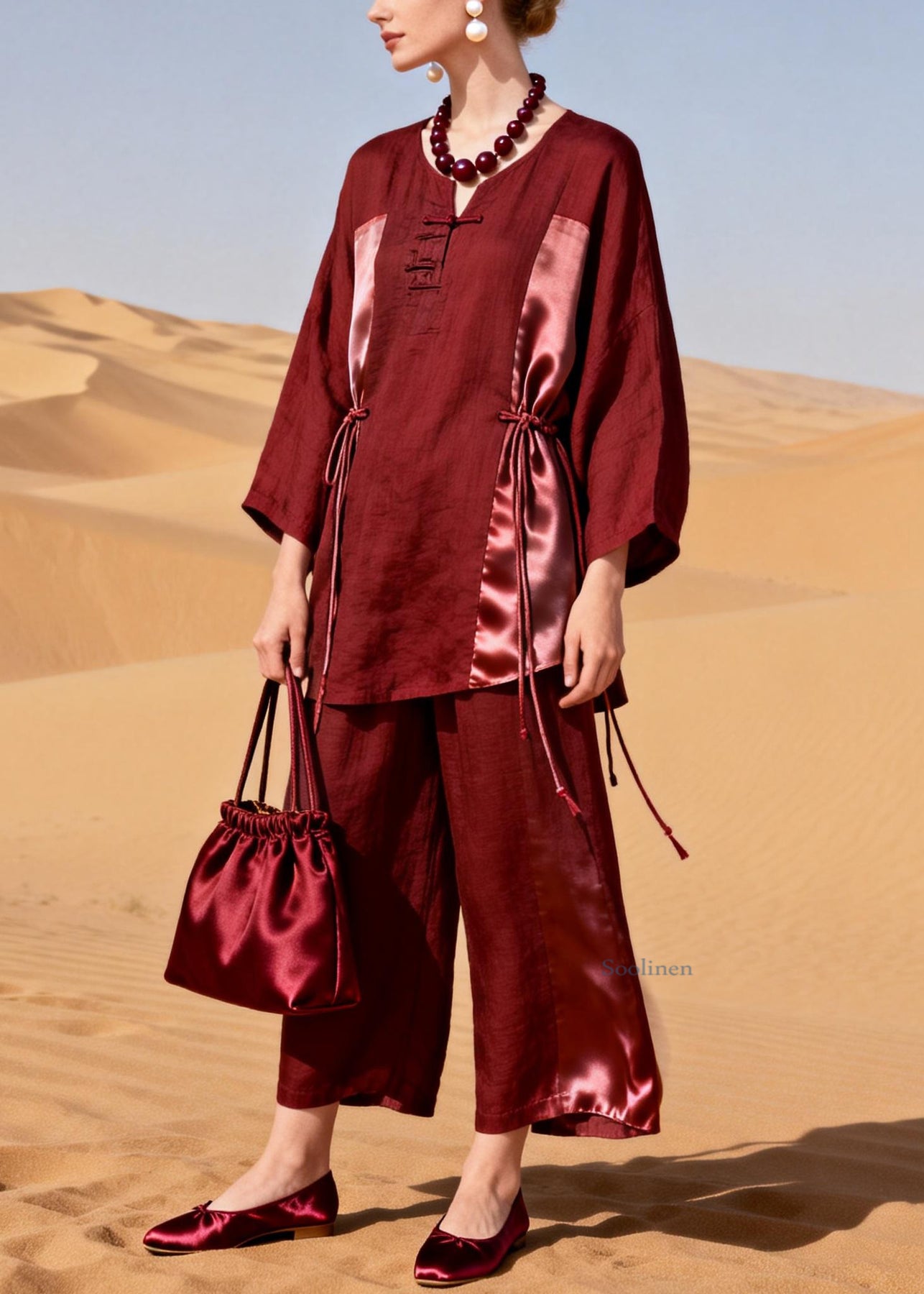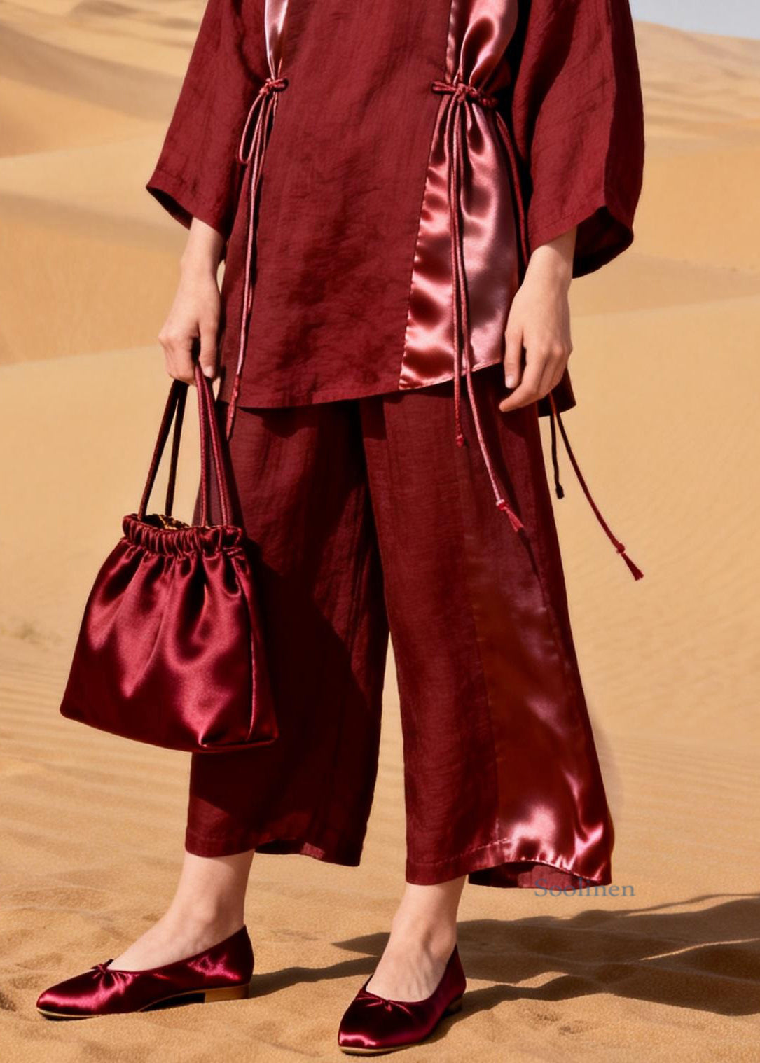 Red Tops And Crop pants Patchwork Silk Linen Two Pieces Set Drawstring Spring
