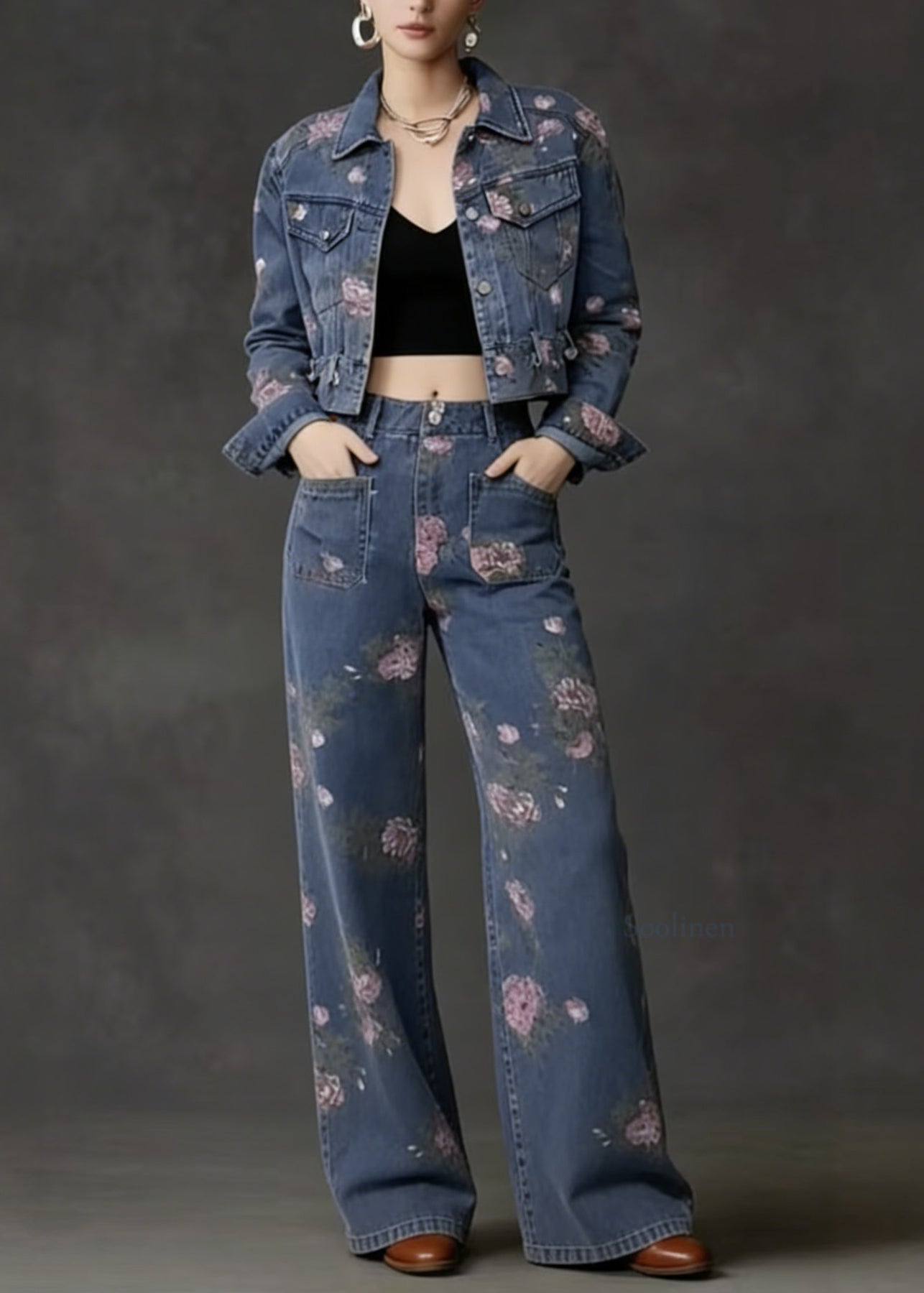 French Peter Pan Collar Print Pockets Denim Two Piece Suit Set Spring