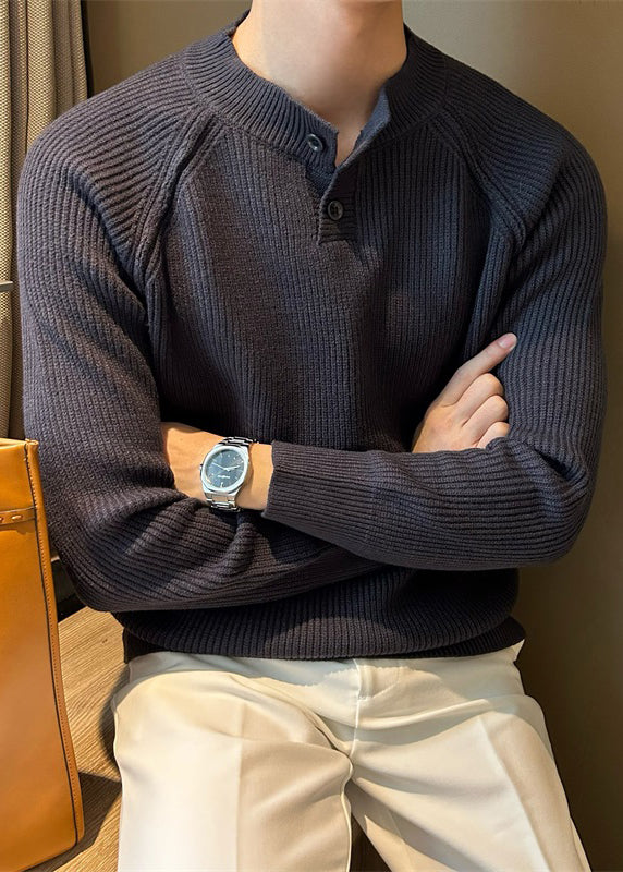Dark Gray Button Cozy Knit Fall Mens Pullover Tops O Neck