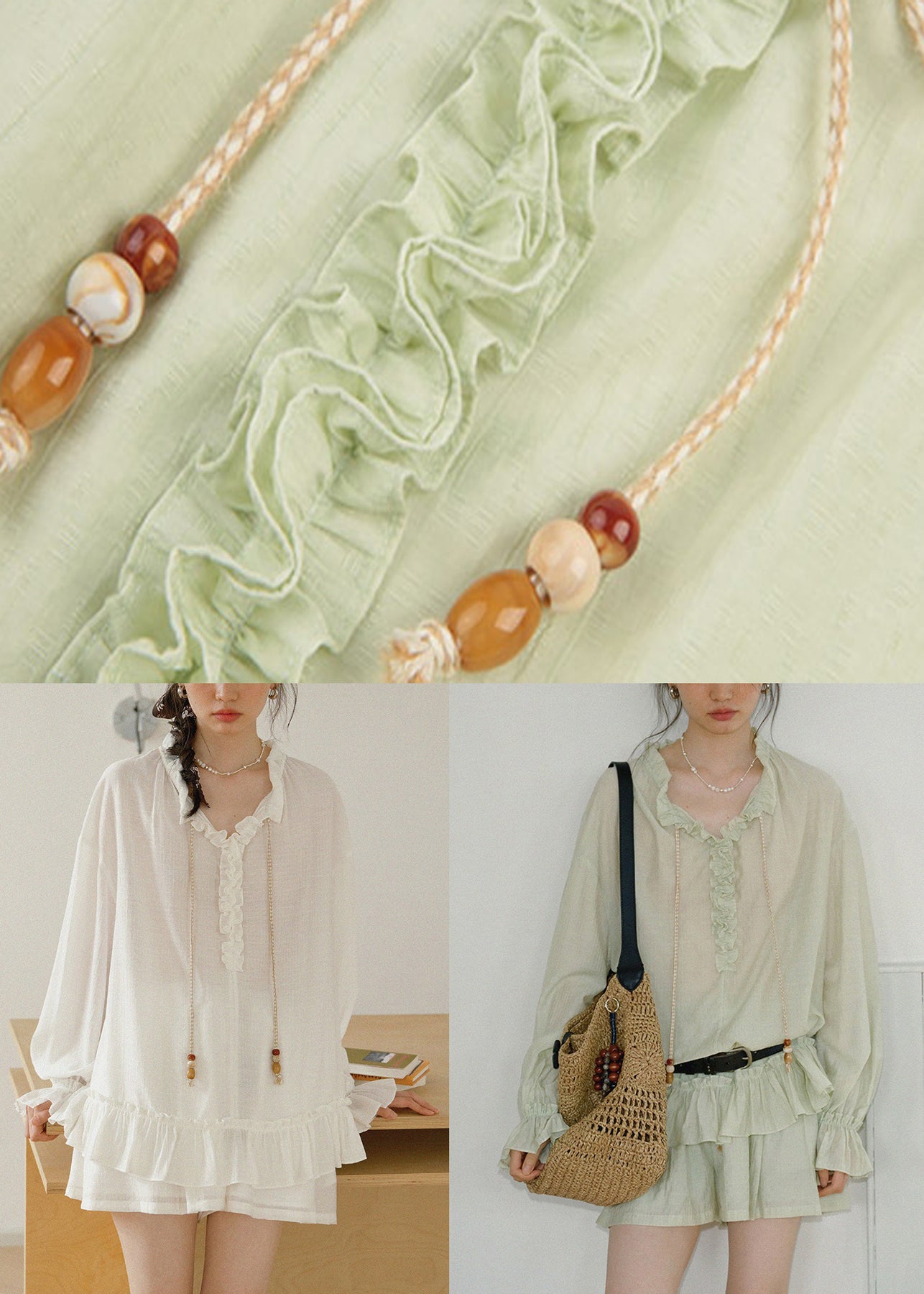 Loose White Ruffled Lace UpCotton Two Pieces Set Butterfly Sleeve