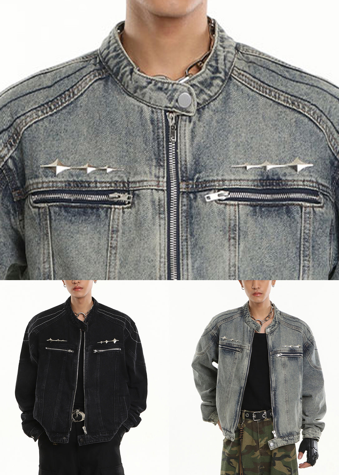 New Black Stand Collar Zip Up Pockets Denim Mens Coats Fall