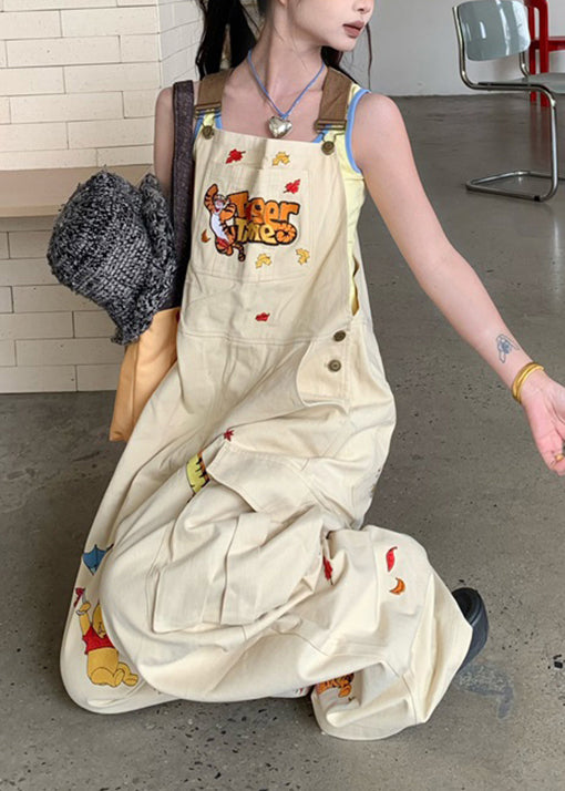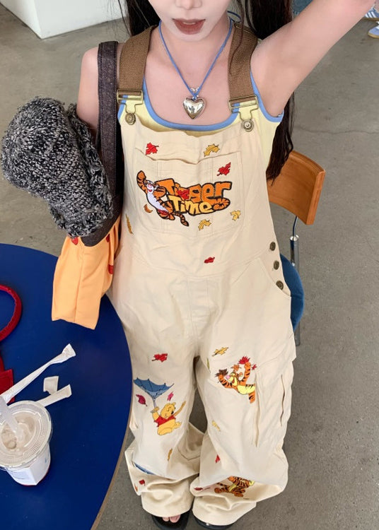 Original Design Apricot Embroidered Denim Overalls Jumpsuit Autumn